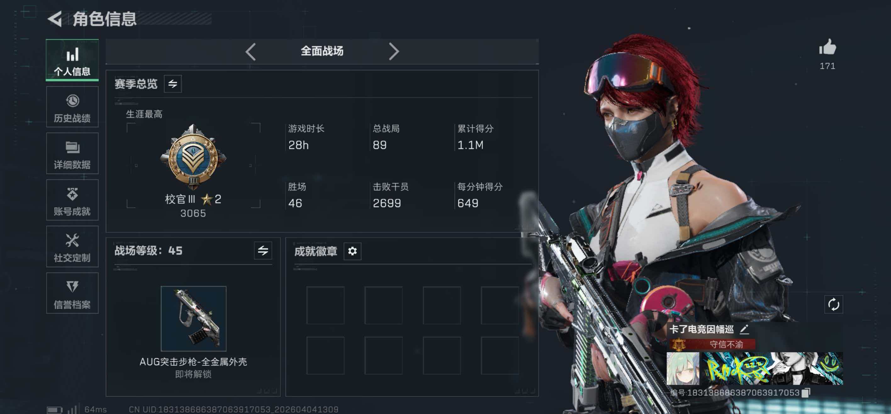 hssjz3185总资产615.03M,哈夫币 27811.02K,战场等级:45 列兵,行动等级:60 铂金,角色皮肤14,枪皮数量275【特战干员外观】红狼-蚀金玫瑰,骇爪-水墨云图,蛊-能天使·午夜邮差,露娜-黑·天际线,骇爪-维什戴尔,牧羊人-街头之王,威龙-铁面判官,威龙-壮志凌云,威龙-飞虎,蜂医-送葬人·无题密令,无名-夜鹰,红狼-电锯惊魂,露娜-金牌射手,深蓝-不破誓约,【近战