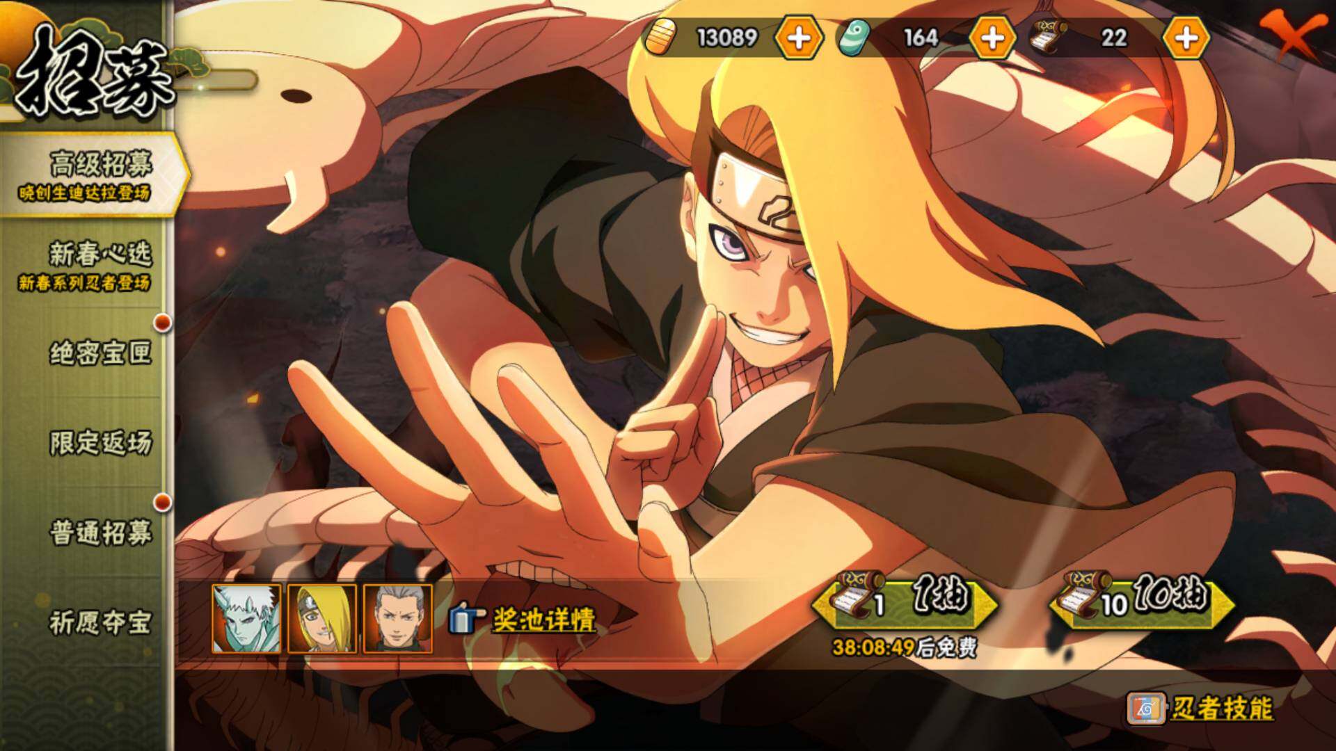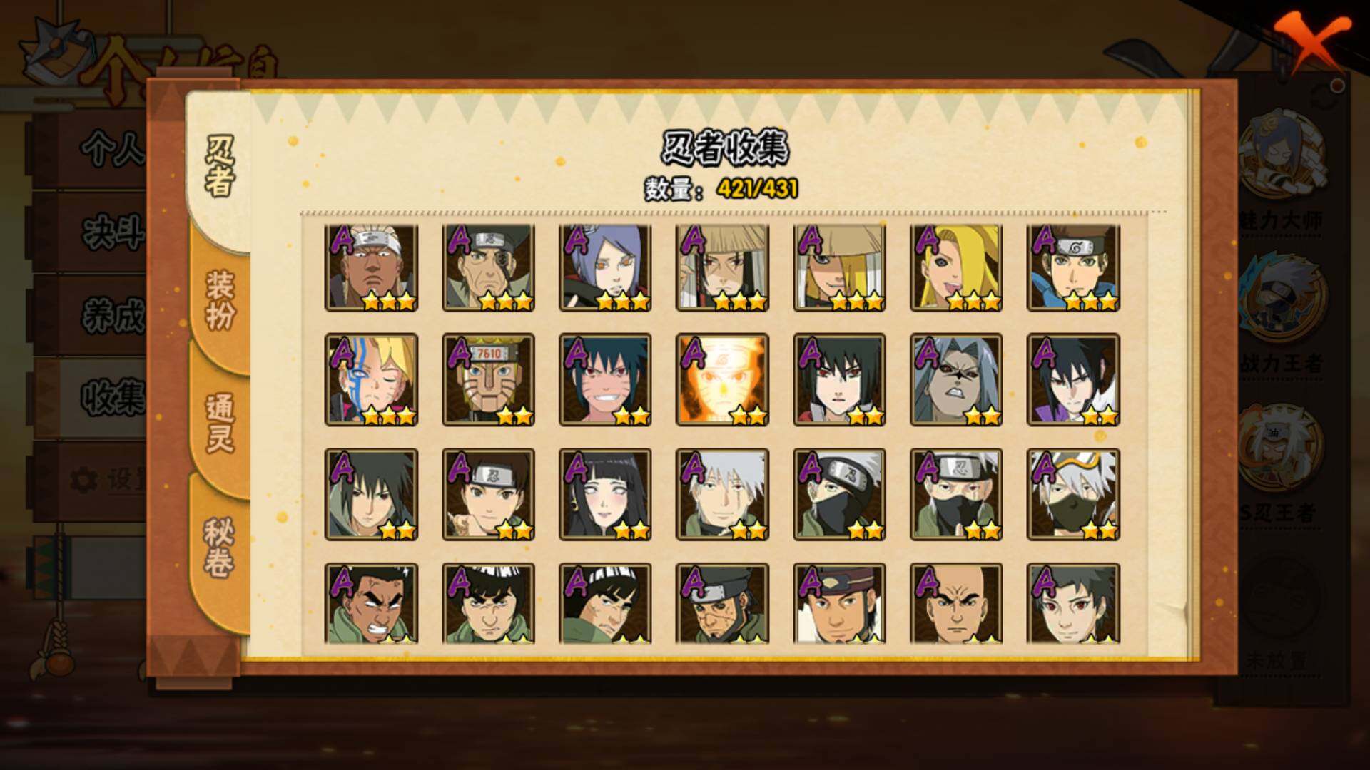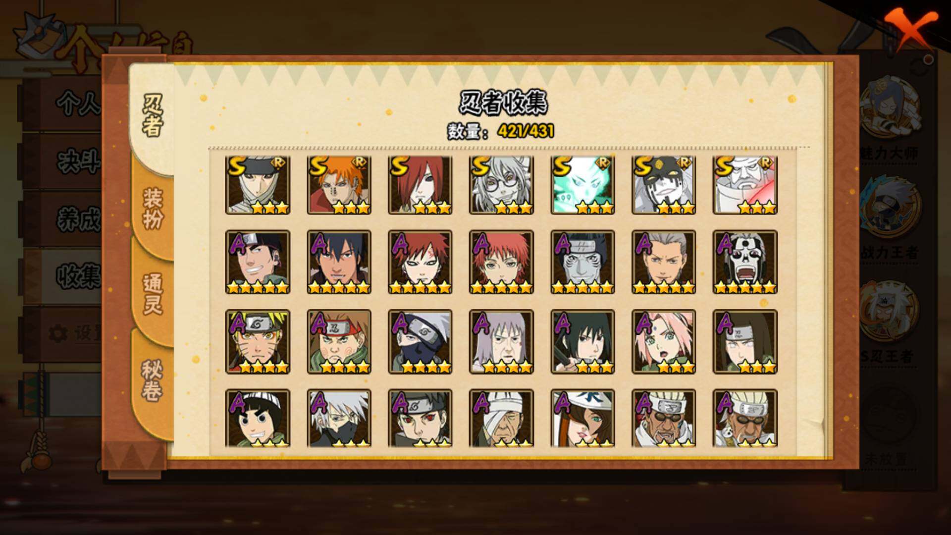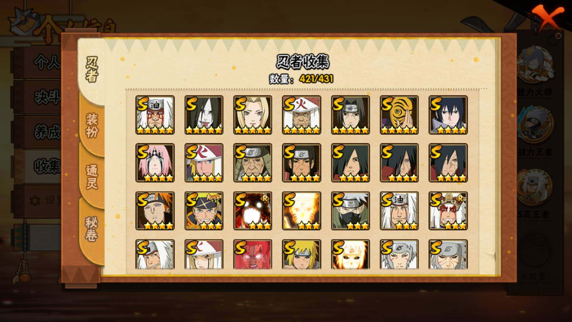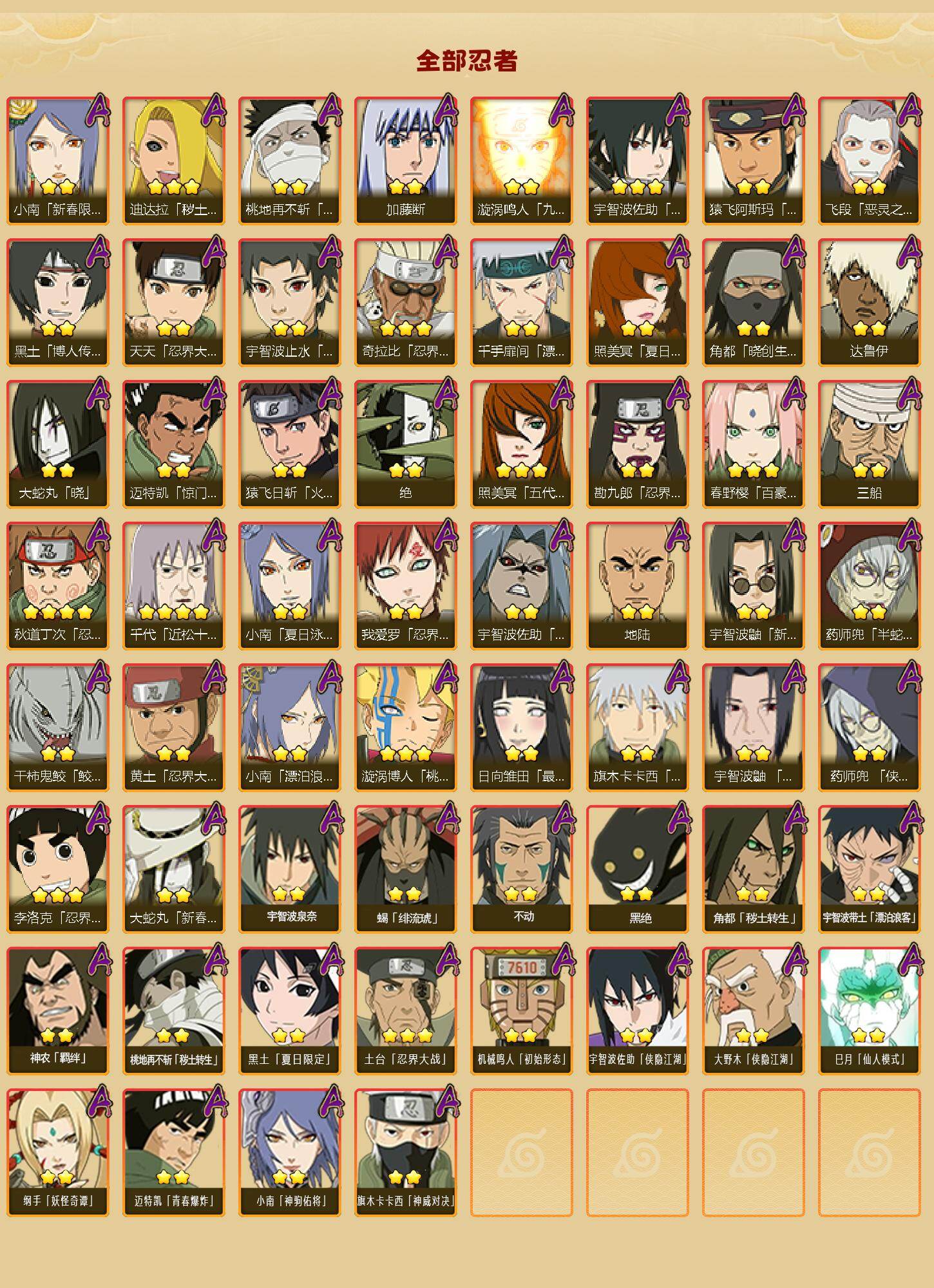 【S级忍者】:长门「秽土转生」(3星),三代目风影「秽土转生」(3星),半藏「秽土转生」(3星),金角·银角「秽土转生」(3星),猿飞日斩「秽土转生」(4星),波风水门「秽土转生」(3星),千手扉间「秽土转生」(3星),千手柱间「秽土转生」(4星),宇智波鼬「秽土转生」(3星)
