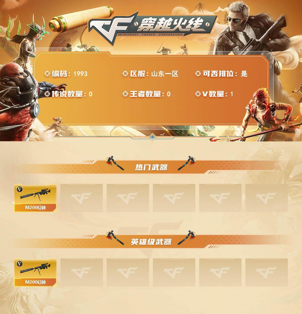 山东一区-1V-0王者武器数-0炫金武器数【热门武器】:M200-幻神【英