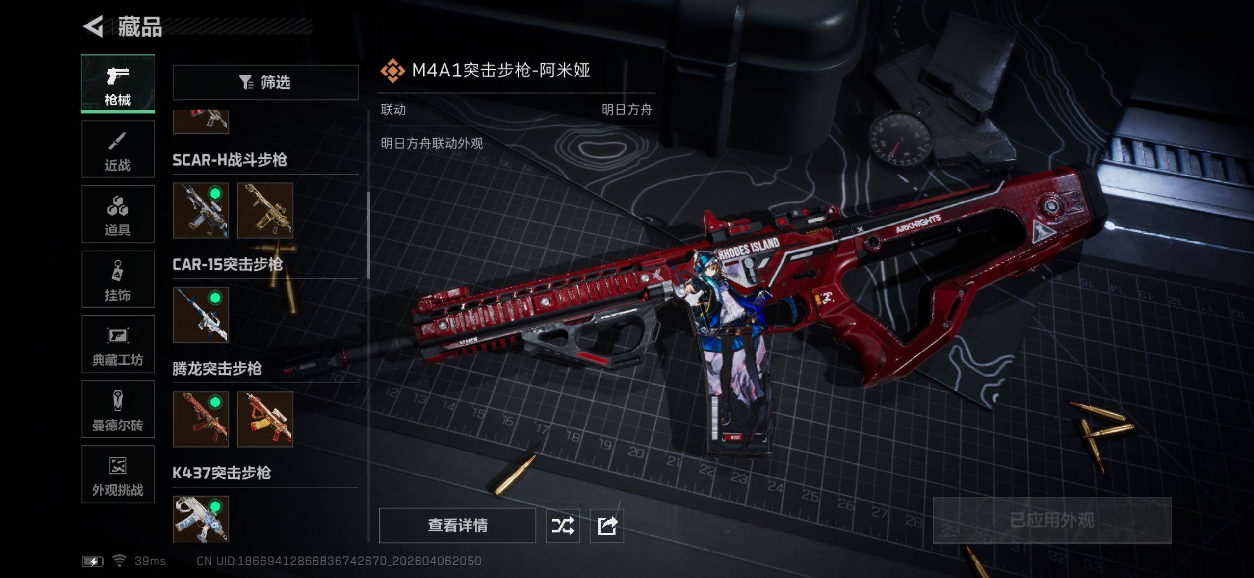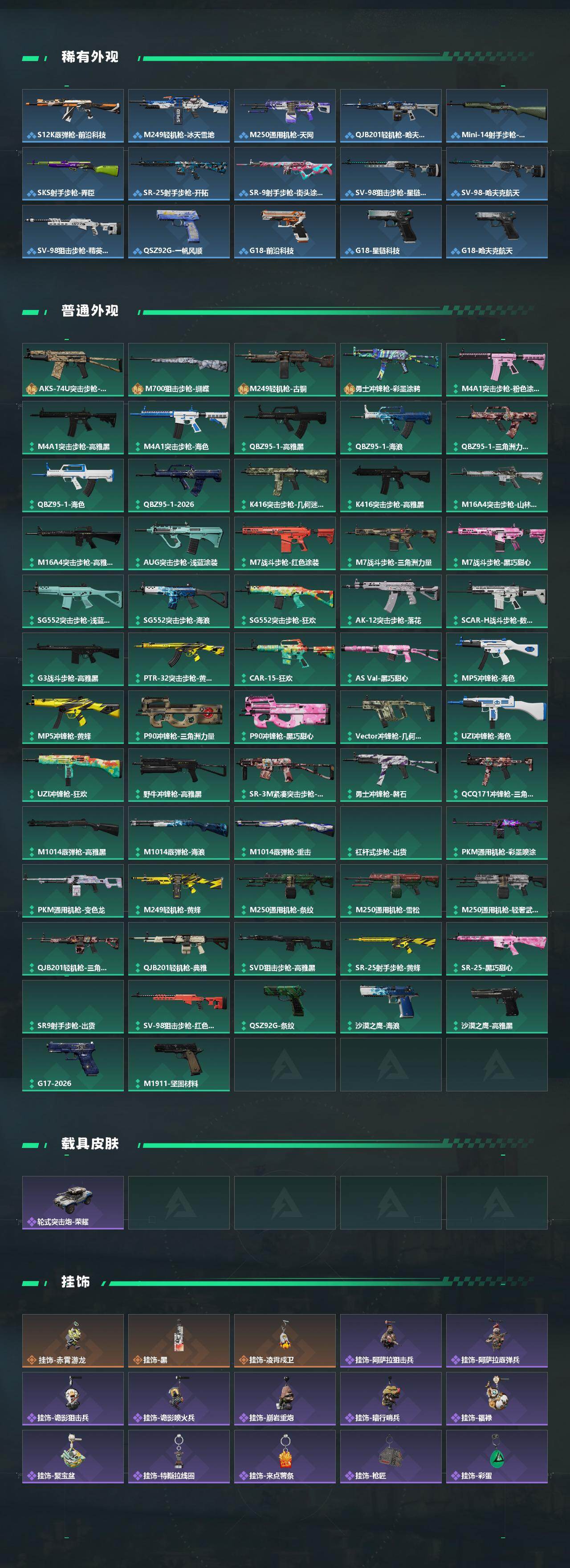 【传说外观】:M4A1突击步枪-阿米娅,AKM突击步枪-锦绣,ASh-12战斗步枪-鹅鸭杀,SG552突击步枪-点翠,AK-12突击步枪-特斯拉线圈,SCAR-H战斗步枪-水墨云图,SCAR-H战斗步枪-启航,CAR-15突击步枪-