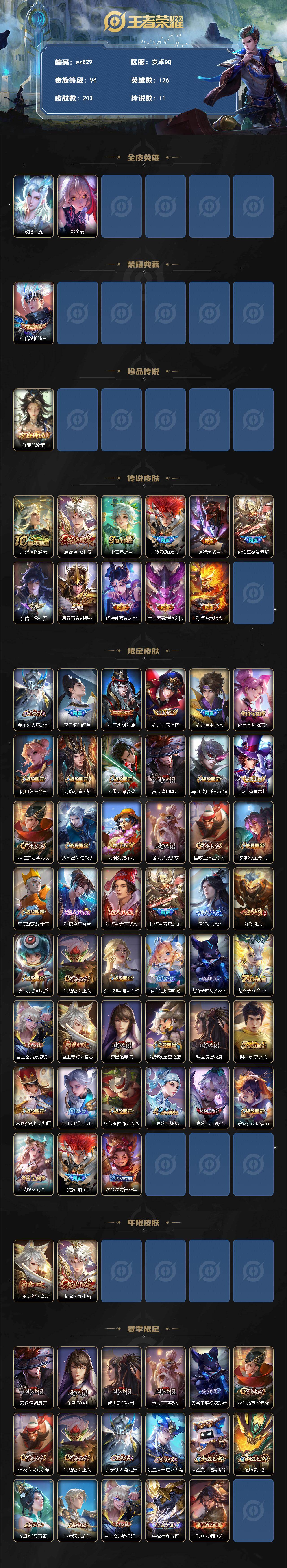 安卓Q-V6-永恒钻石II段位-126英雄-203皮肤-1典藏皮肤-1珍品传说-11传说-70史诗