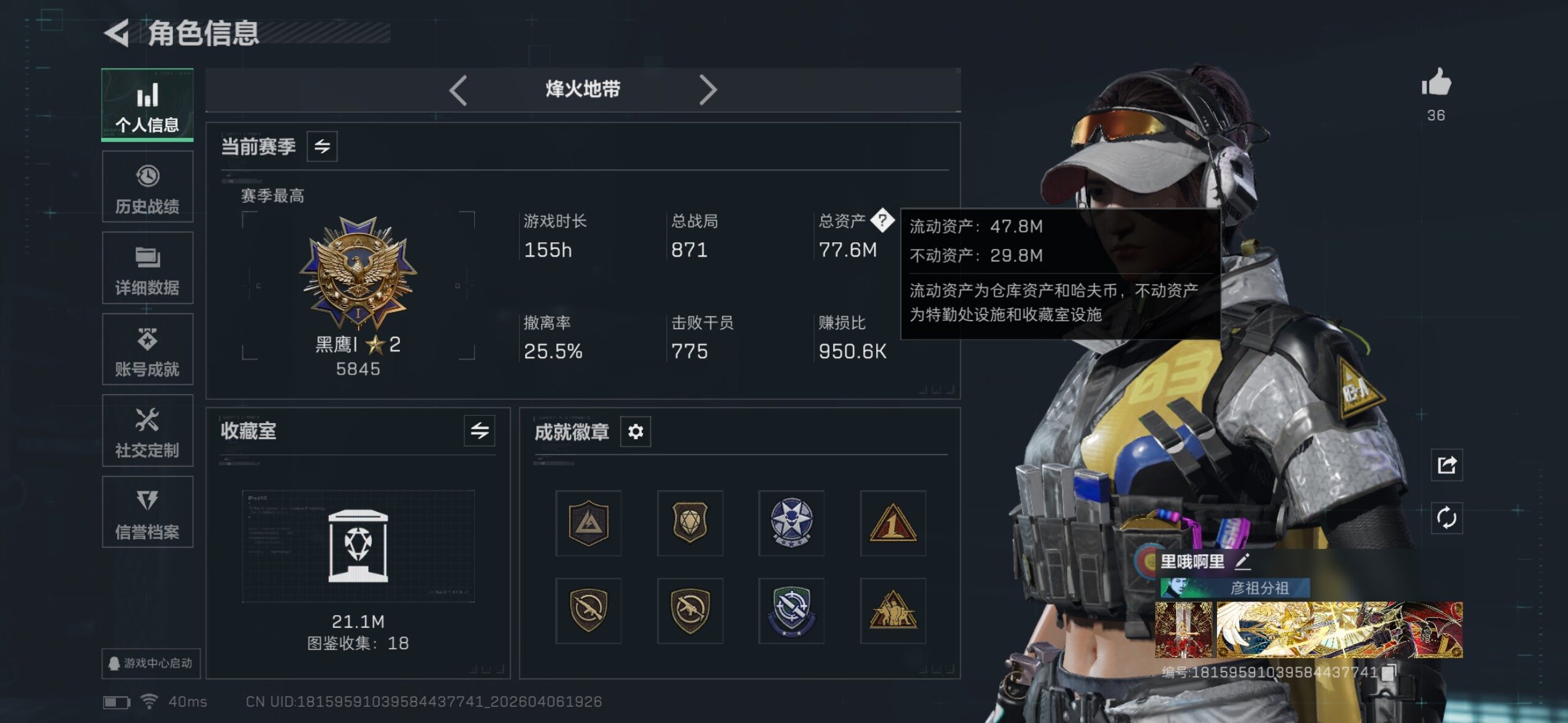 77m总资产-576k哈夫币-60烽火等级-黑鹰-33战场等级-尉官【干员外