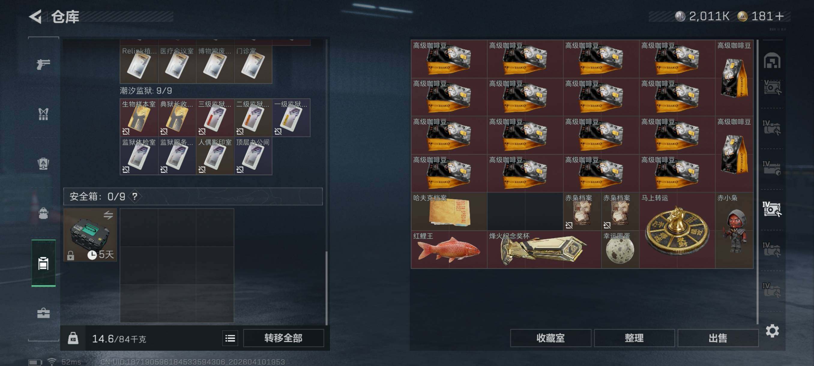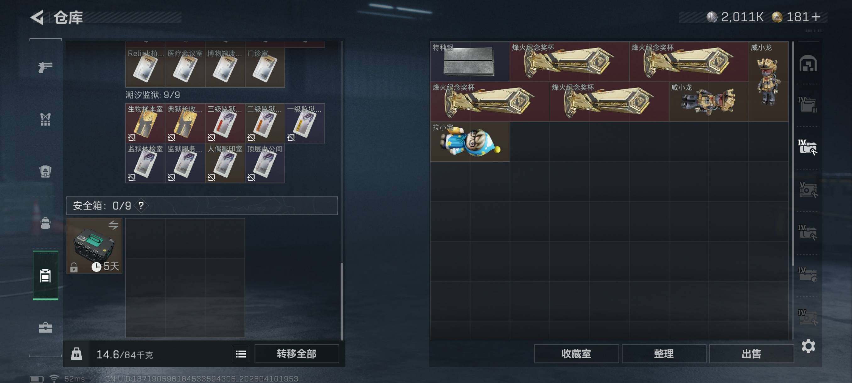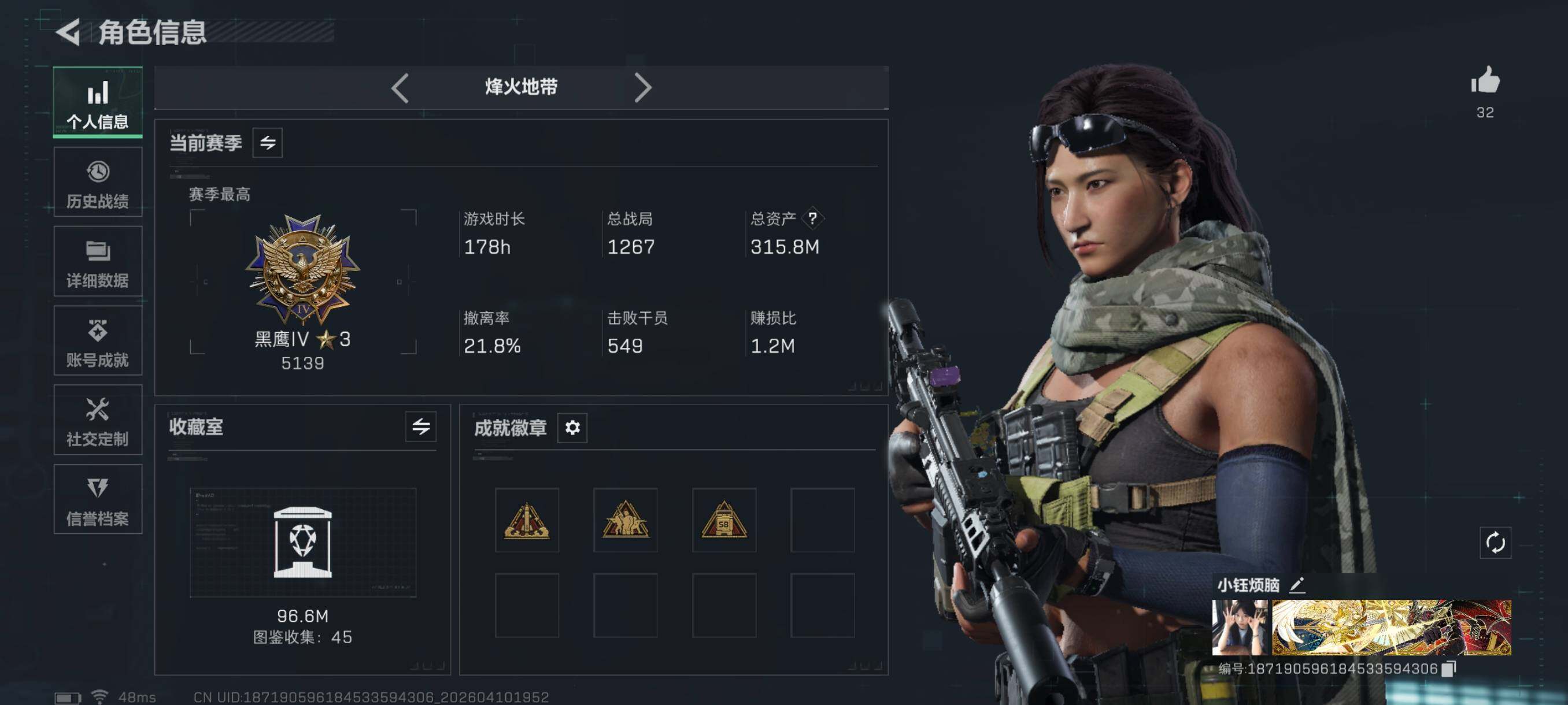 {特价出售}等级:60 总资产:315.8M 纯币 2011k 红皮:乌鲁鲁-荒原猎手/蛊-不羁人生 刀皮:暗星 特勤处:仓库9,训练7,靶场6