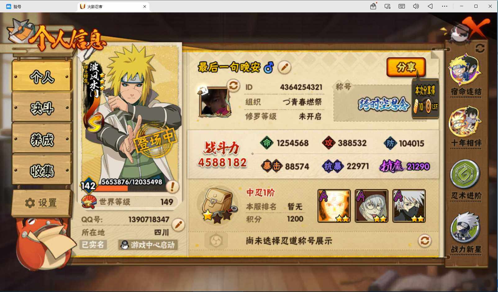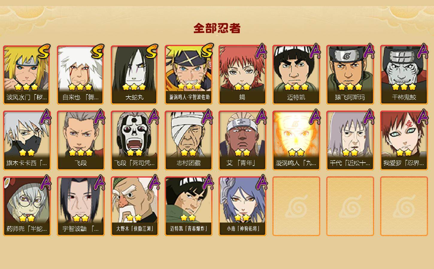 【HYF2708】V5/战力458W/S忍4/A忍17/3星自来也「舞之豪杰」/2星大野木「侠隐江湖」/2星飞段「死司凭血」/2星小南「神驹佑将」/3星飞段/2星蝎/2星药师兜「半蛇斗篷」/3星漩涡鸣人·宇智波佐助/2星宇智波鼬「夏日限定」/2星志村团藏/3星波风水门「秽土转生」/2星我爱罗「忍界大战」/3星大蛇丸/3星迈特凯/2星艾「青年」/2星漩涡鸣人「九尾查克拉」/2星旗木卡卡西「万花筒写