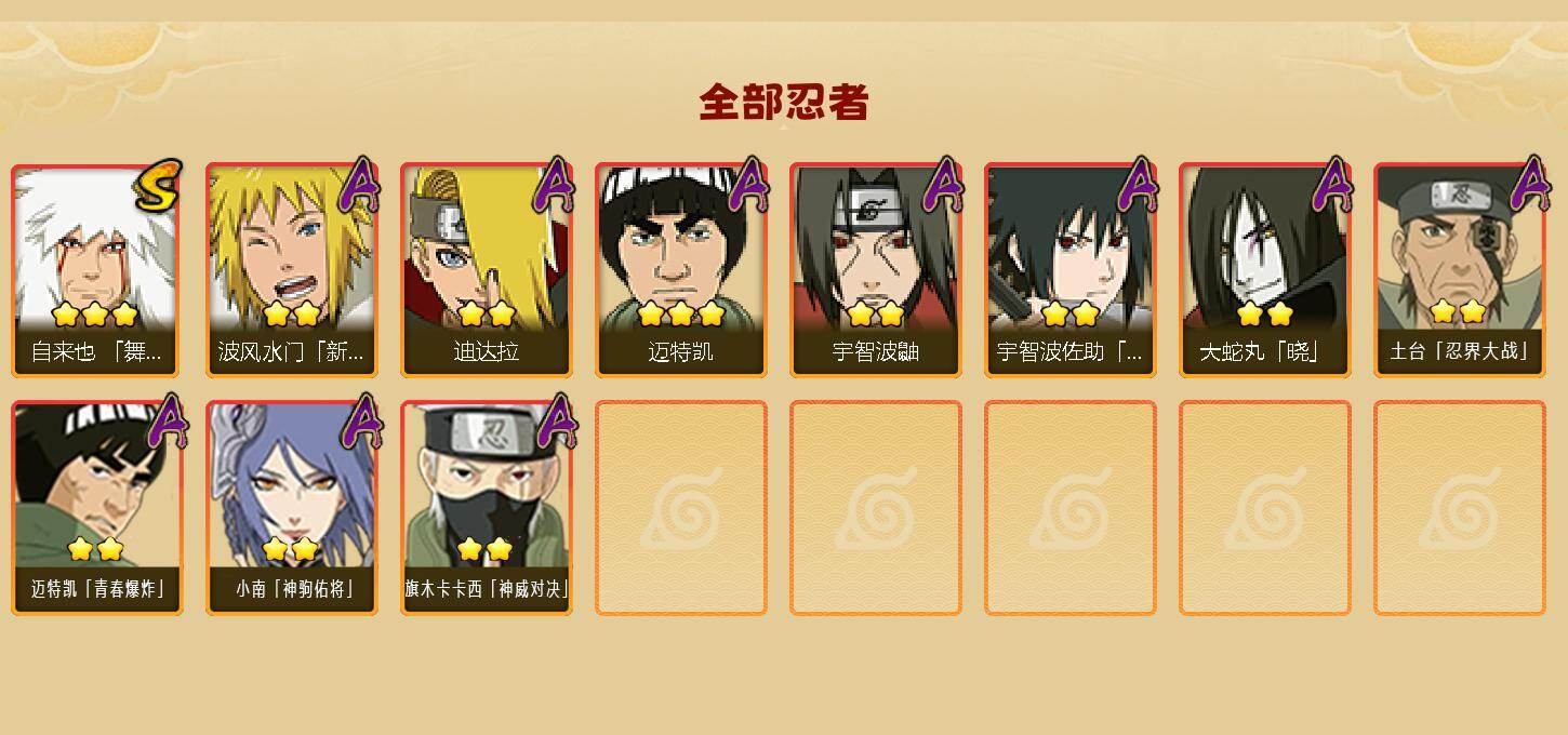 【A级忍者】:波风水门「新春限定」(2星),迪达拉(2星),大蛇丸「晓」(2星),迈特凯(3星),旗木卡卡西「神威对决」(2星),小南「神驹佑将」(2星),宇智波鼬(2星),宇智波佐助「须佐能乎」(2星),土台「忍界大战」(2星),迈特凯「青春爆炸」(2星)
