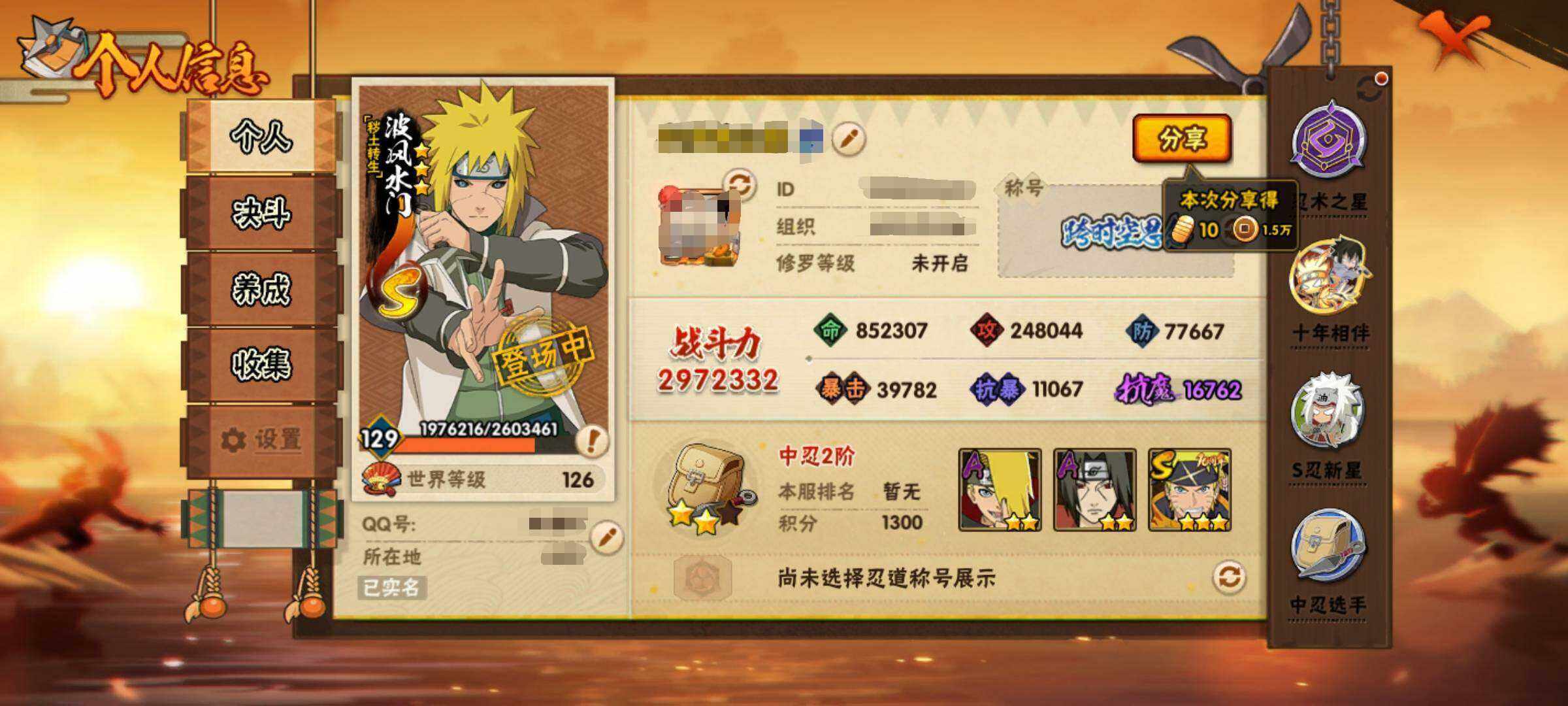 【HYX3709】V6/战力290W/S忍7/A忍19/2星我爱罗「疾风传」/3星波风水门「九喇嘛连结」/2星宇智波鼬/3星旗木卡卡西「须佐能乎」/2星迈特凯/2星蝎/3星佩恩「天道」/3星漩涡鸣人·宇智波佐助/3星波风水门「秽土转生」/2星秋道丁次「忍界大战」/2星漩涡博人「桃式显现」/2星李洛克「忍界大战」/2星神秘面具男「忍者之路」/2星旗木卡卡西「神威对决」/3星自来也「舞之豪杰」/2星