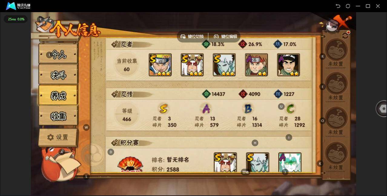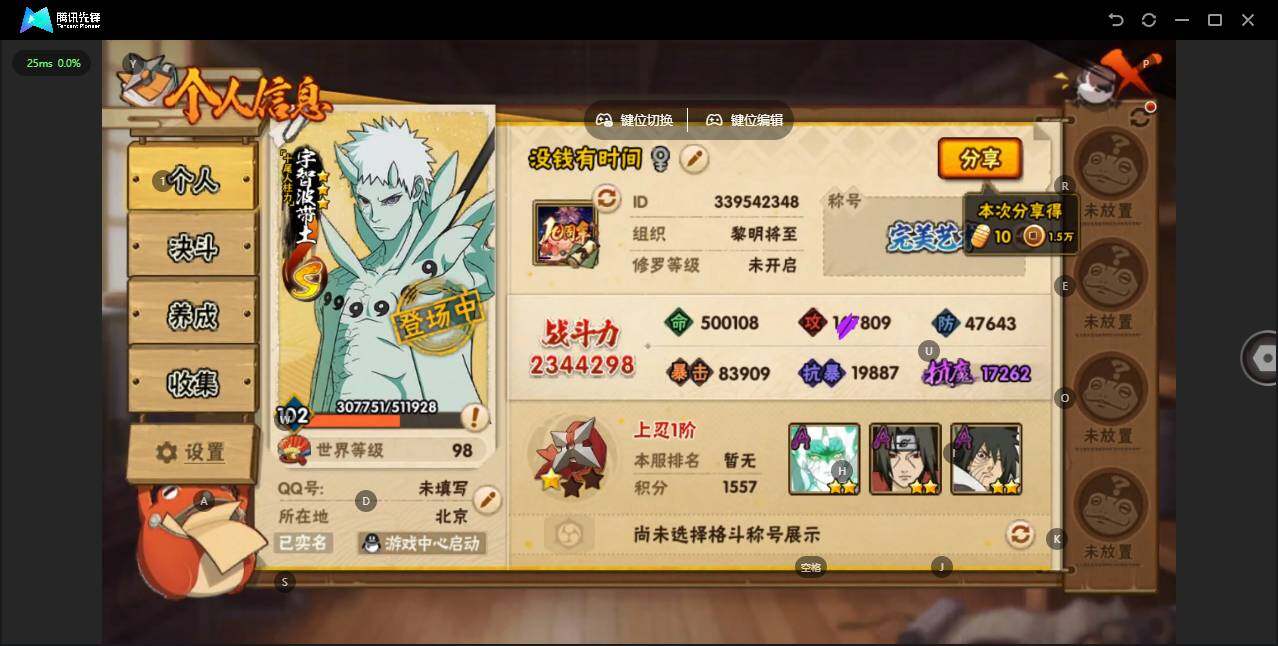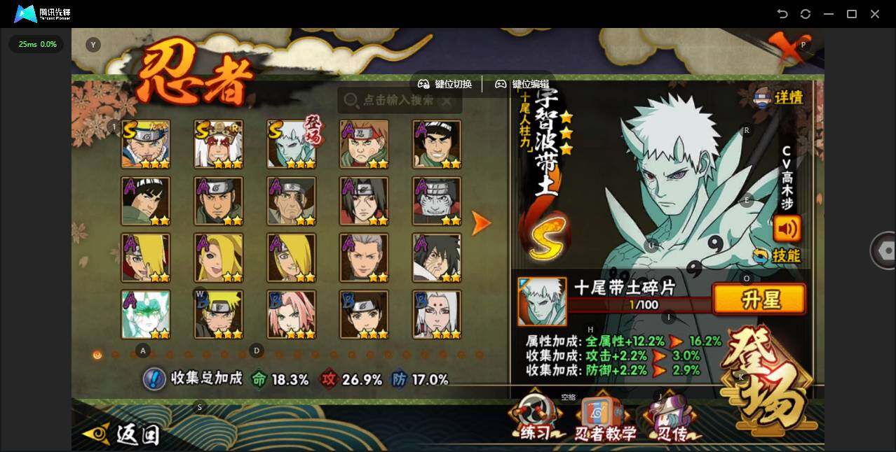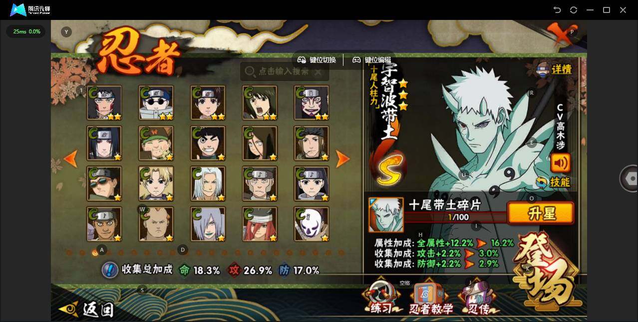 贵族等级: V1 ,S忍数: 3, A忍数: 13 , 自来也「舞之豪杰」(3星),漩涡鸣人·宇智波佐助(3星),宇智波带土「十尾人柱力」(3星)