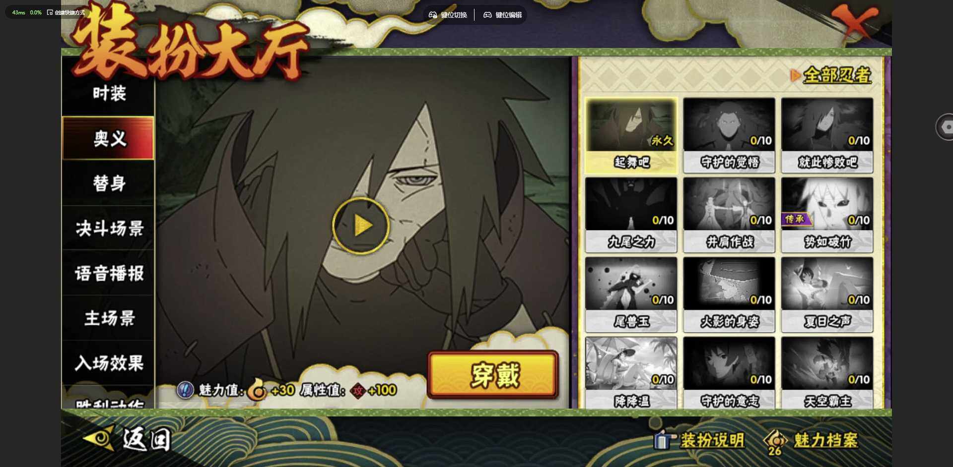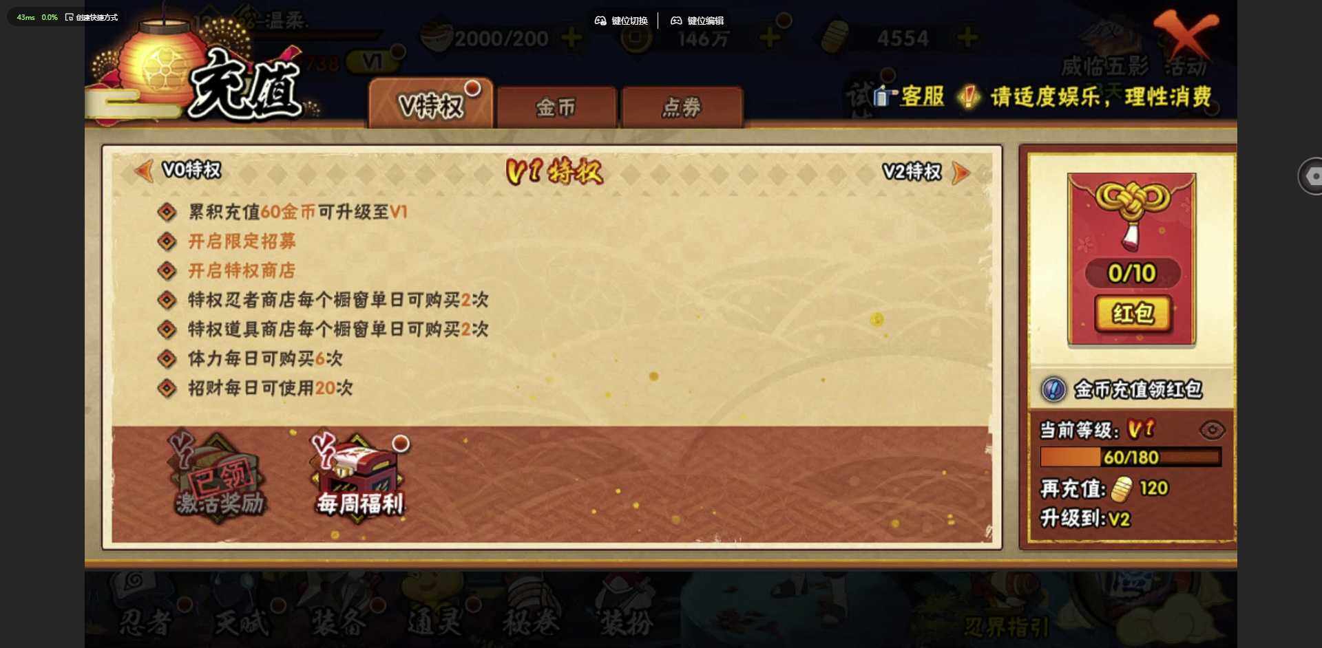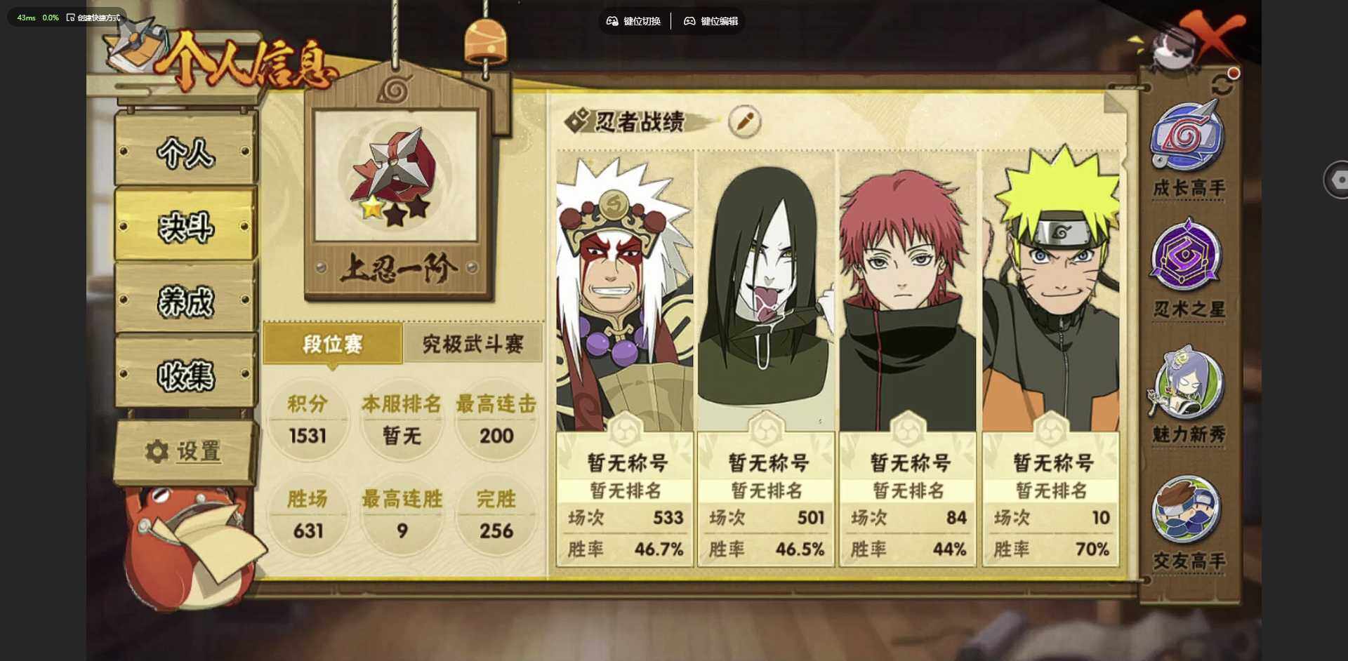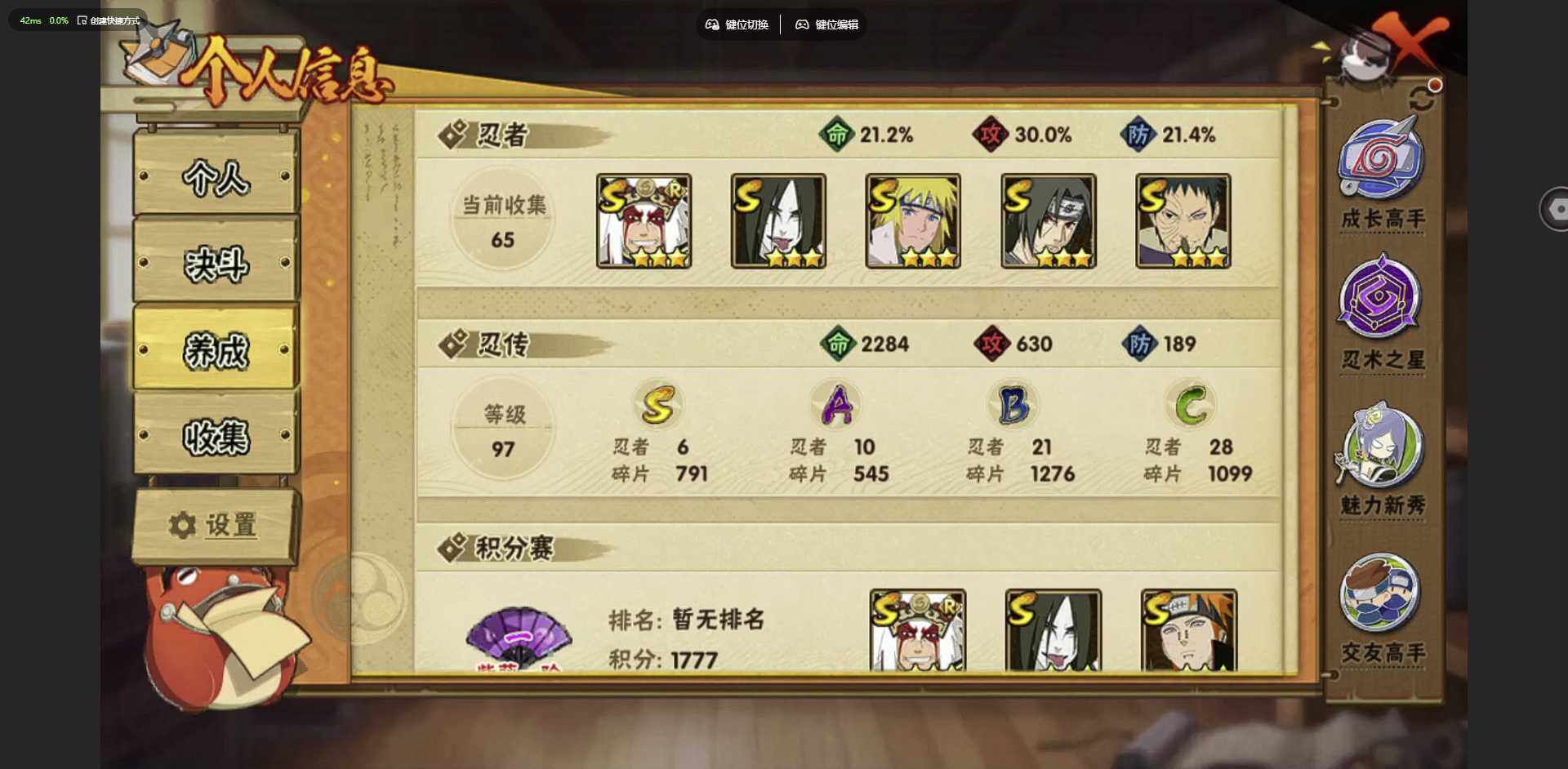 实名: 可修改 贵族等级: V1 S忍数: 6 A忍数: 10 战力值(万):