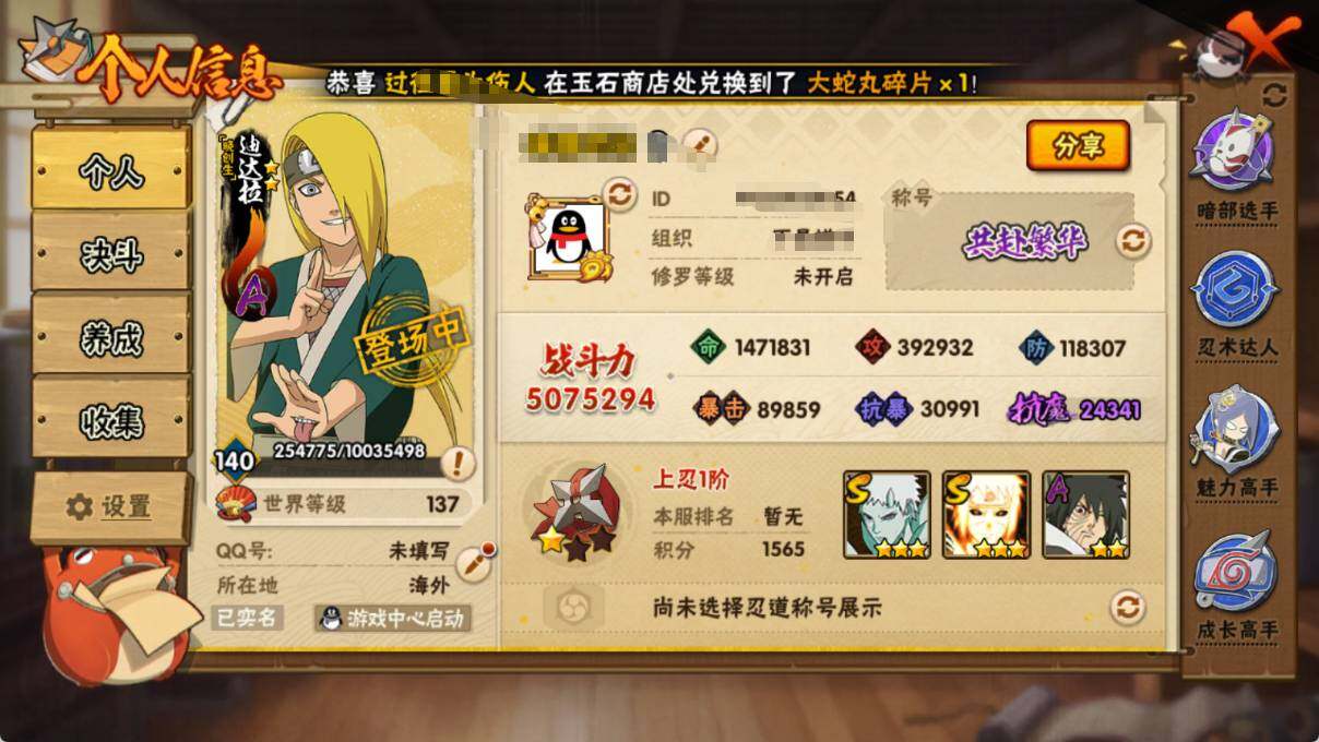 【HYYH1439】V5/战力507W/S忍7/A忍26/2星大野木「侠隐江湖」/2星我爱罗「疾风传」/3星波风水门「九喇嘛连结」/2星飞段「死司凭血」/2星宇智波鼬/2星长门「青年」/2星迈特凯/2星小南「神驹佑将」/3星飞段/2星蝎/3星佩恩「天道」/3星漩涡鸣人·宇智波佐助/2星李洛克「忍界大战」/2星土台「忍界大战」/2星旗木卡卡西「神威对决」/2星蝎「绯流琥」/3星自来也「舞之豪杰」/