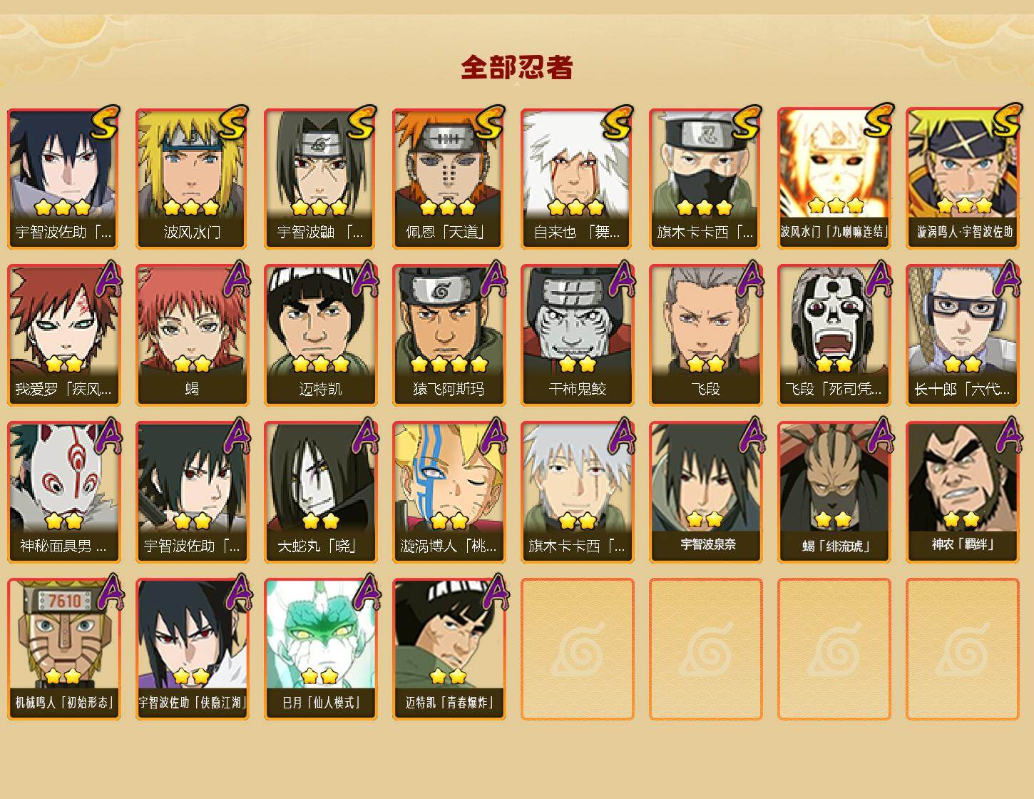 【S级忍者】:宇智波鼬「须佐能乎」(3星),旗木卡卡西「须佐能乎」(3星),自来也「舞之豪杰」(3星),波风水门(3星),佩恩「天道」(3星),宇智波佐助「永恒万花筒」(3星),波风水门「九喇嘛连结」(3星),漩涡鸣人·宇智波佐助(3星)