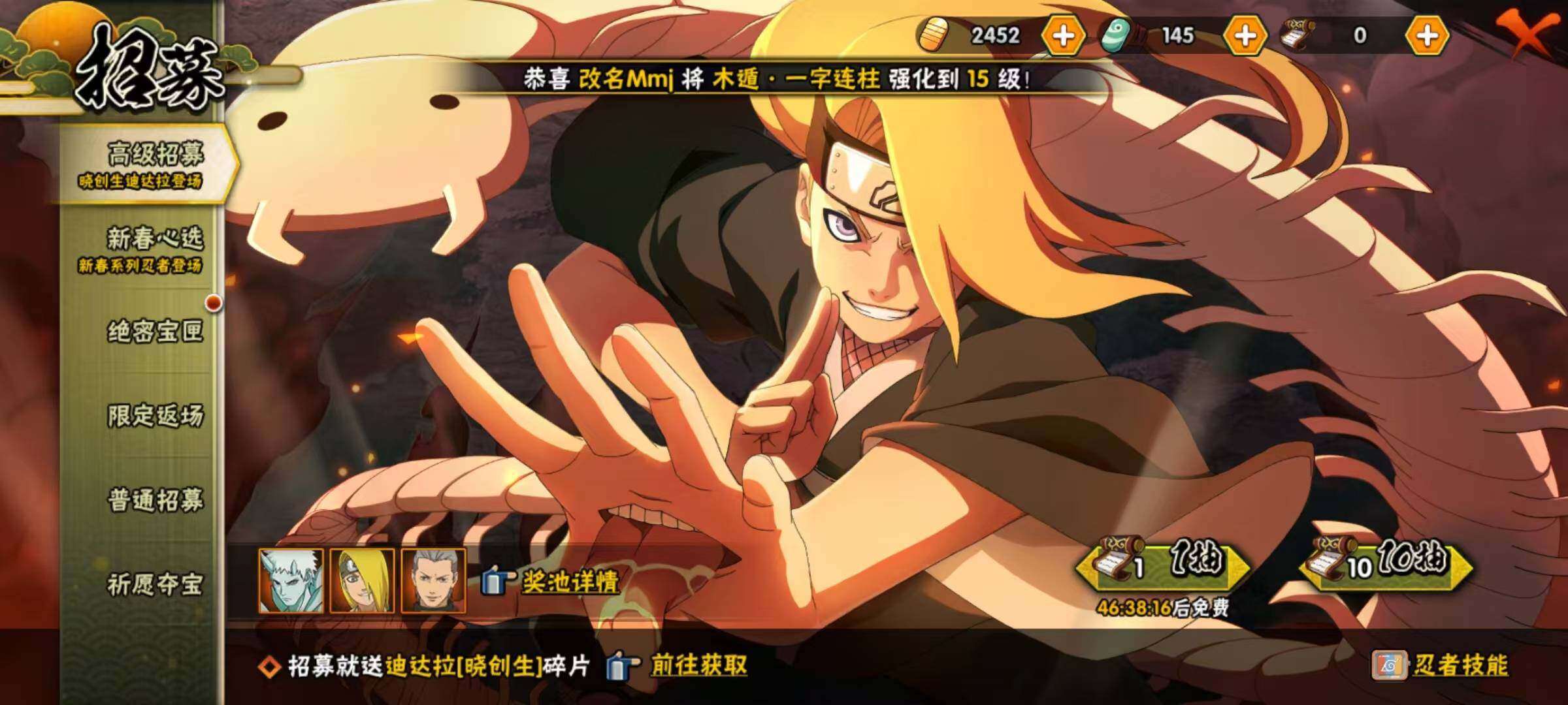 【S级忍者】:春野樱「忍界大战」(3星),宇智波鼬「须佐能乎」(3星),自来也「舞之豪杰」(3星),自来也「传说中的三忍」(3星),波风水门(3星),漩涡鸣人「九喇嘛连结」(3星),佩恩「天道」(3星),波风水门「九喇嘛连结」(3星),漩涡鸣人·宇智波佐助(3星)