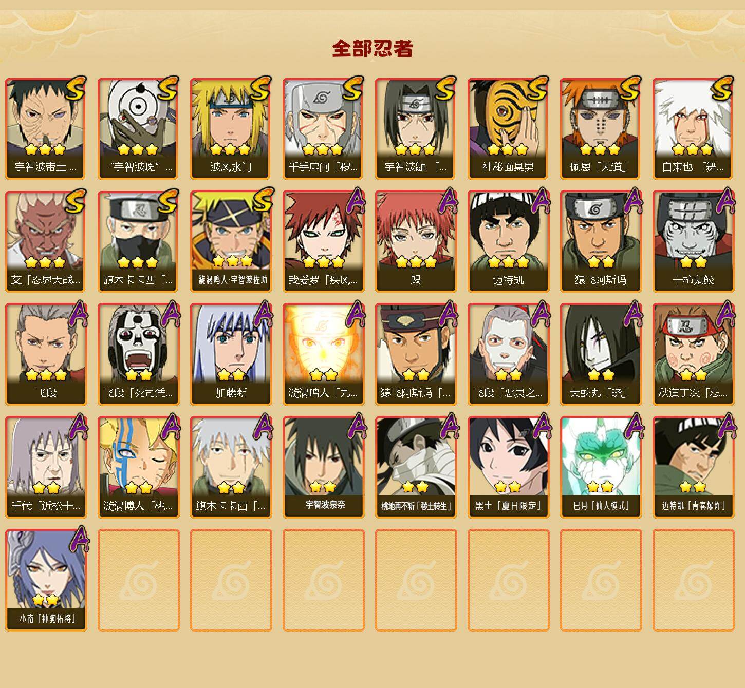 【S级忍者】:千手扉间「秽土转生」(3星),宇智波带土「忍界大战」(3星),艾「忍界大战」(3星),宇智波鼬「须佐能乎」(3星),旗木卡卡西「须佐能乎」(3星),自来也「舞之豪杰」(3星),波风水门(3星),神秘面具男(3星),佩恩「天道」(3星),宇智波斑 「白面具」(3星宇智波斑「白面具」),漩涡鸣人·宇智波佐助(3星)