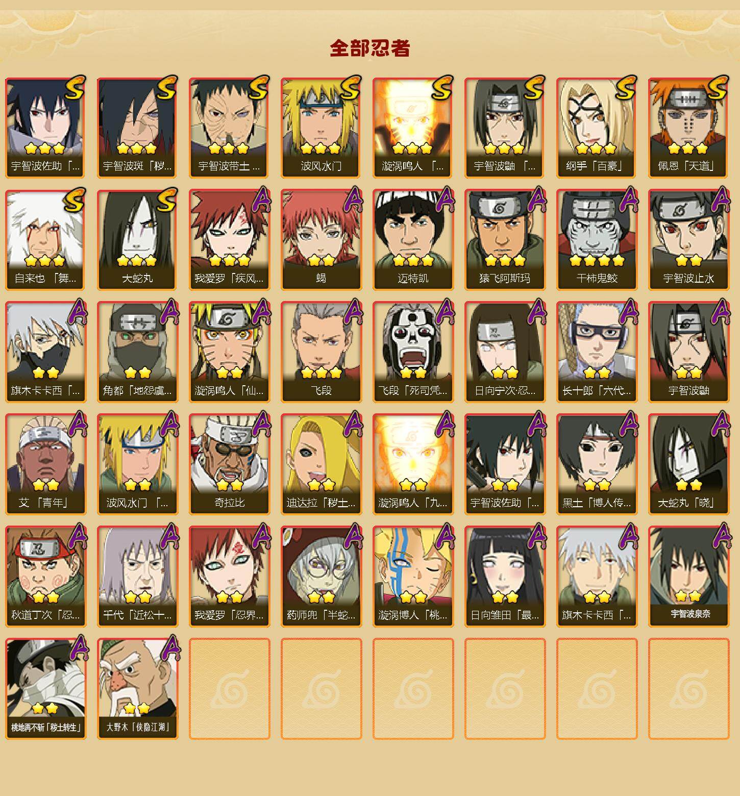 【S级忍者】:宇智波斑「秽土转生·解」(3星),宇智波带土「忍界大战」(3星),宇智波鼬「须佐能乎」(3星),自来也「舞之豪杰」(3星),大蛇丸(3星),纲手「百豪」(3星),波风水门(3星),漩涡鸣人「九喇嘛连结」(3星),佩恩「天道」(3星),宇智波佐助「永恒万花筒」(3星)