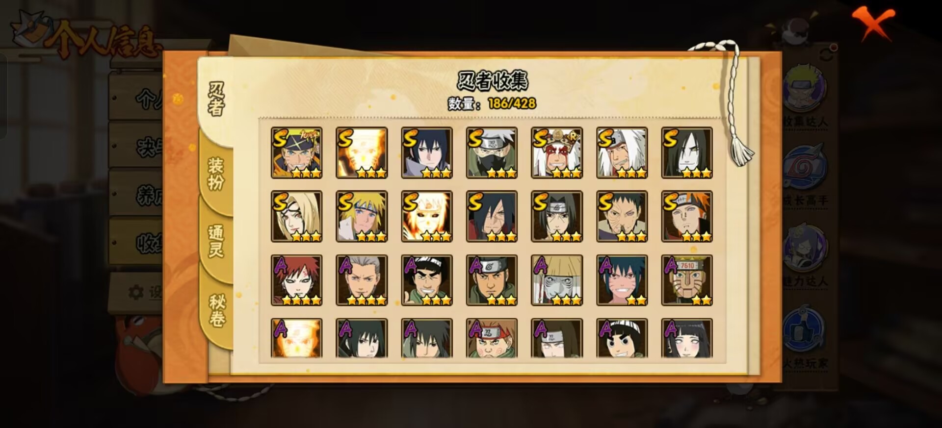 [17490024]实名: 可修改 贵族等级: V7 S忍数: 14 A忍数: 36 战力值(万): 481 S级忍者: 纲手「百豪」,佩恩「天道」,大蛇丸,波风水门,自来也,宇智波鼬 「须佐能乎」,宇智波带土 「忍界大战」,自来也 「舞之豪杰」,漩涡鸣人 「九喇嘛连结」,宇智波佐助「永恒万花筒」,宇智波斑「秽土转生·解」,旗木卡卡西「须佐能乎」,波风水门「九喇嘛连结」,漩涡鸣人·宇智波佐助 亮