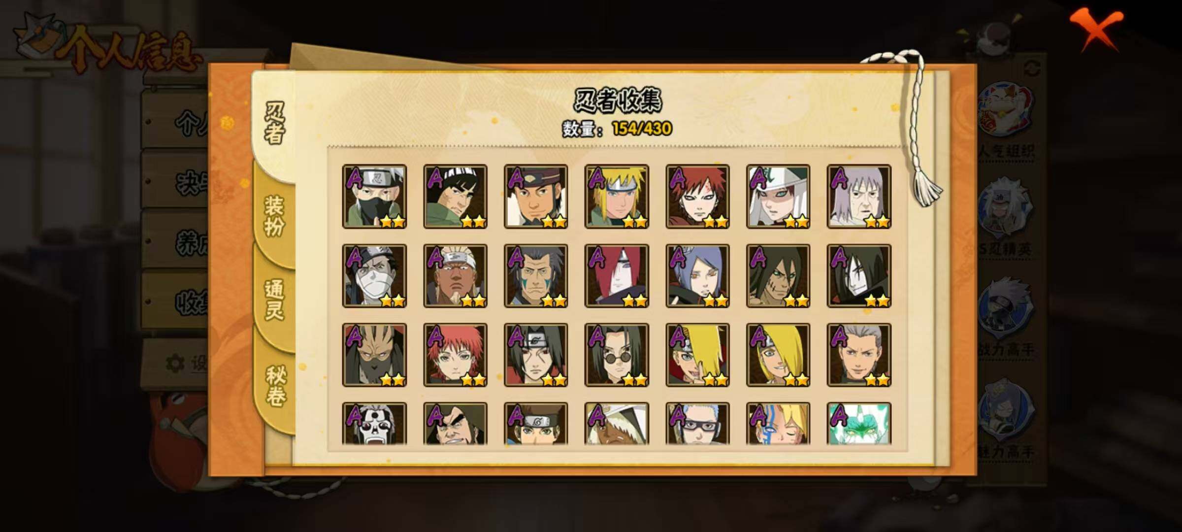 【S级忍者】:波风水门「秽土转生」(3星),春野樱「忍界大战」(3星),艾「忍界大战」(3星),宇智波鼬「须佐能乎」(3星),宇智波止水「须佐能乎」(3星),自来也「舞之豪杰」(3星),纲手(3星),纲手「百豪」(3星),千手柱间(3星),漩涡鸣人「九喇嘛连结」(3星),佩恩「天道」(3星),大筒木舍人「最终章」(3星),漩涡鸣人「暴怒·第六尾」(3星),漩涡鸣人