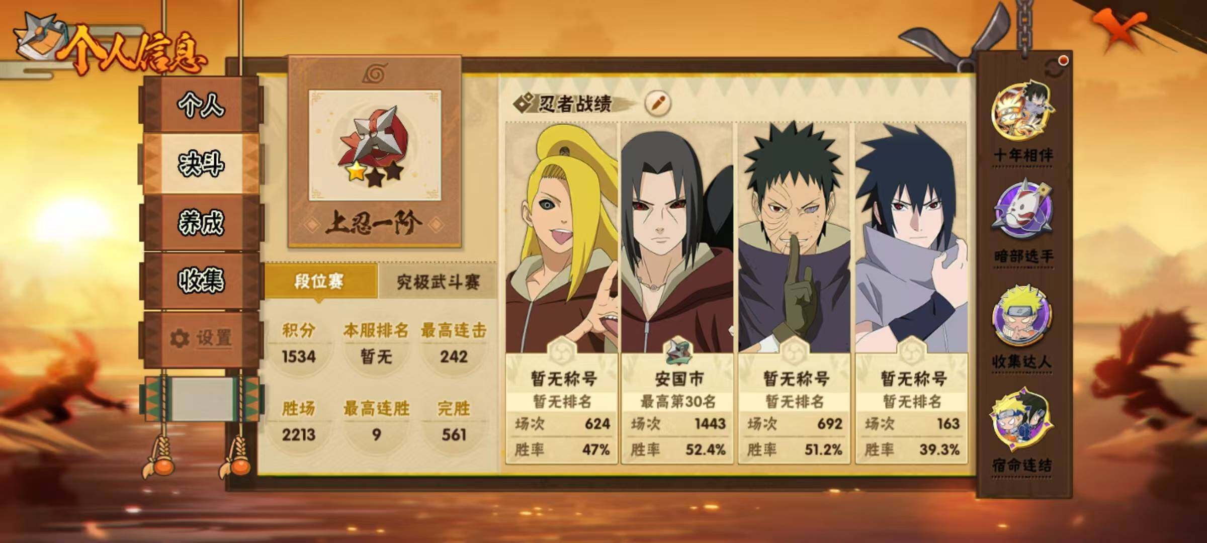【HYYT458】V7/战力781W/S忍14/A忍38/2星大野木「侠隐江湖」/3星宇智波带土「十尾人柱力」/2星达鲁伊「博人传」/2星飞段「死司凭血」/5星猿飞阿斯玛/3星旗木卡卡西「须佐能乎」/2星猿飞日斩「火影继承人」/2星小南「神驹佑将」/2星我爱罗「新春限定」/2星照美冥「五代目水影」/5星迈特凯/2星奇拉比「忍界大战」/2星旗木卡卡西「神威对决」/2星长十郎「六代目水影」/2星蝎「