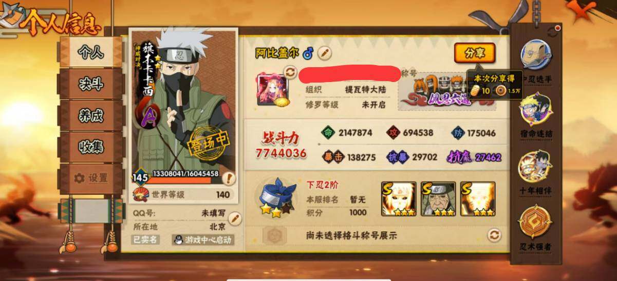 【HYC1727】V10/战力774W/S忍20/A忍29/2星大野木「侠隐江湖」/3星波风水门「九喇嘛连结」/3星宇智波带土「十尾人柱力」/3星旗木卡卡西「须佐能乎」/2星小南「神驹佑将」/3星猿飞日斩「秽土转生」/2星照美冥「五代目水影」/3星千手柱间「木叶创立」/3星干柿鬼鲛/2星旗木卡卡西「神威对决」/3星大筒木桃式/2星蝎「绯流琥」/2星桃地再不斩「秽土转生」/3星宇智波斑「白面具」/