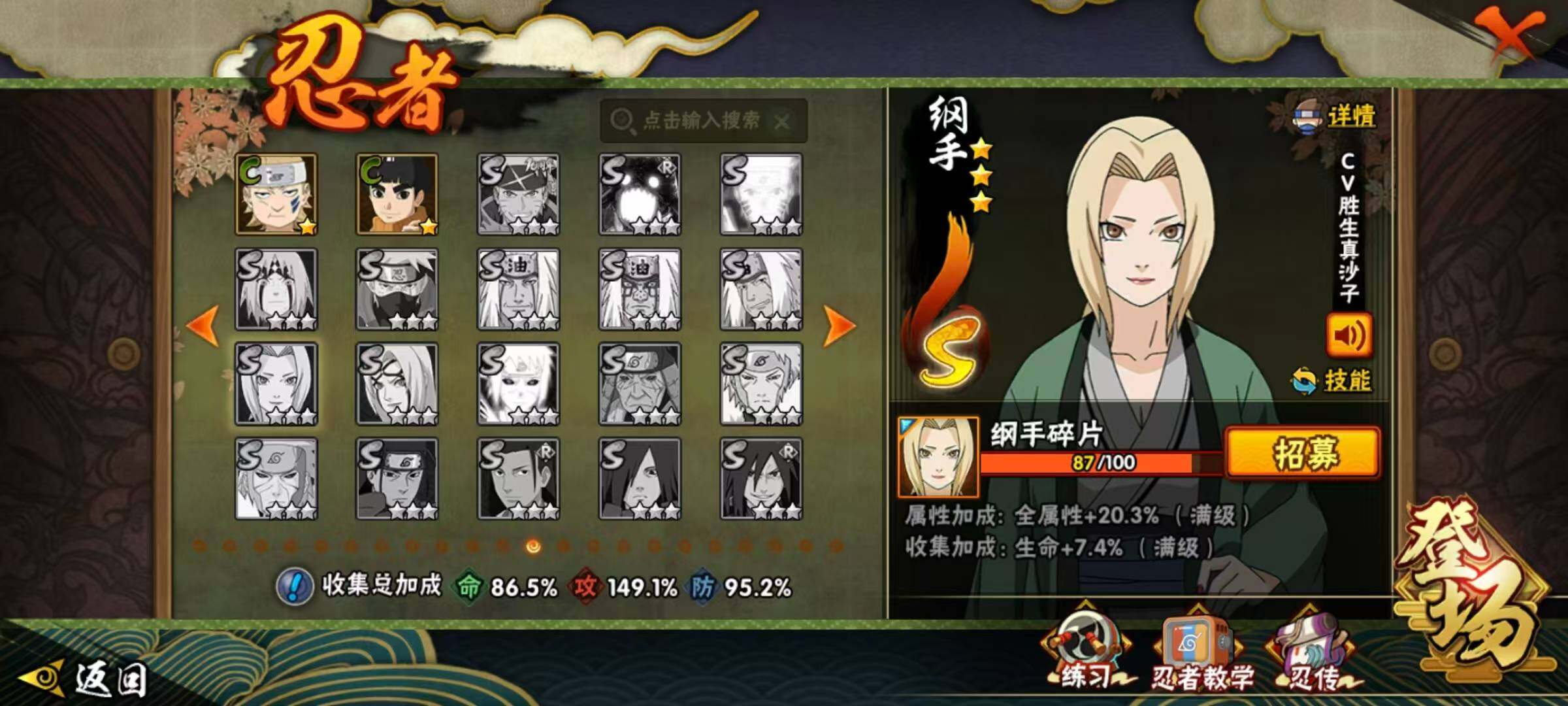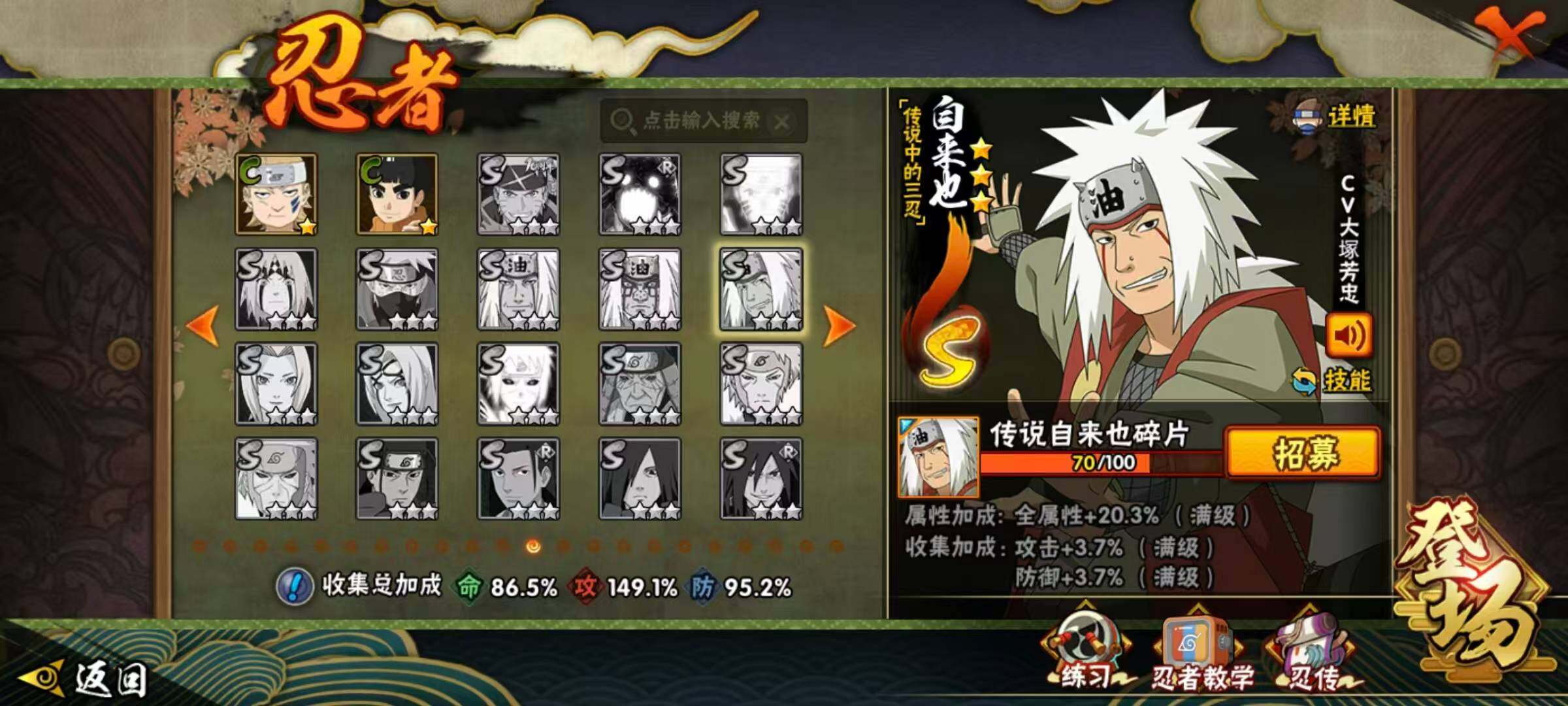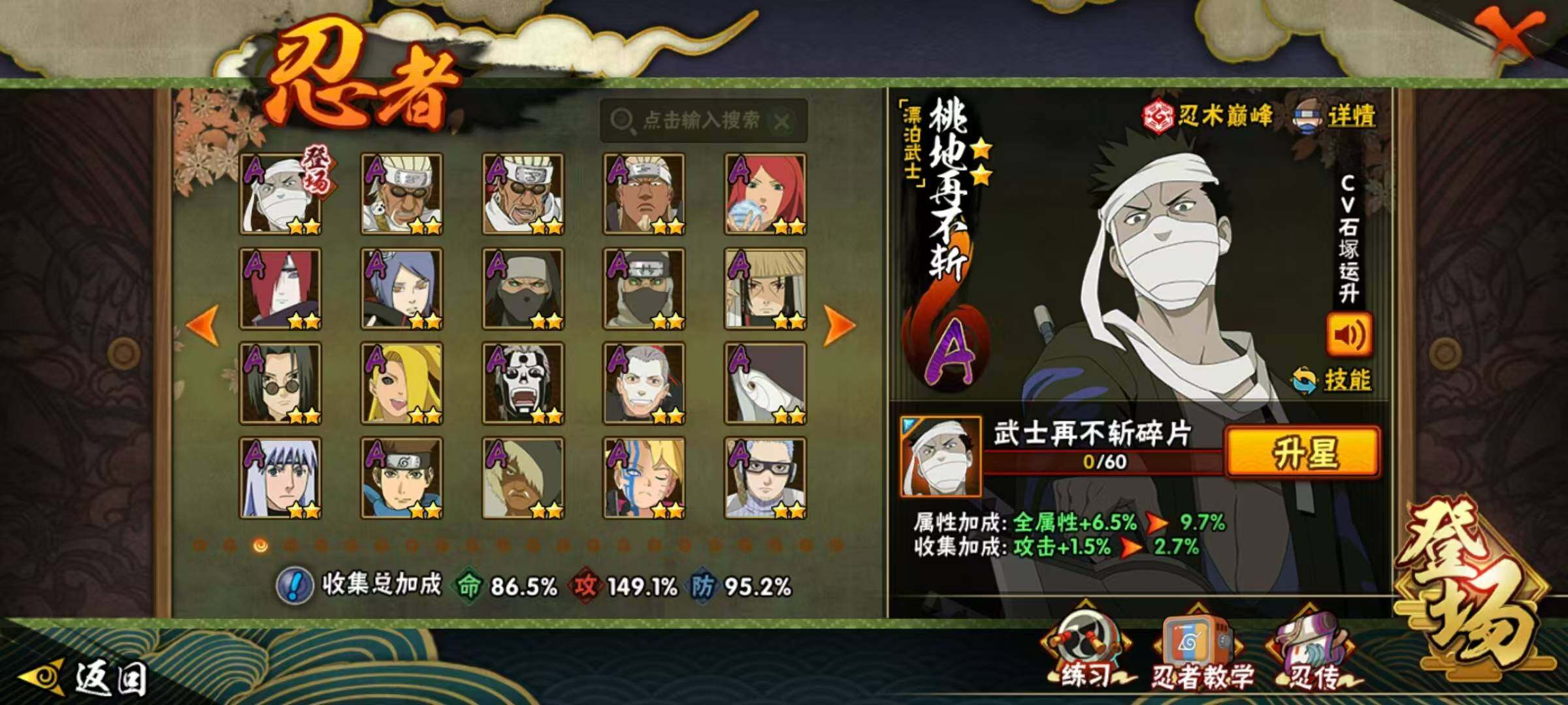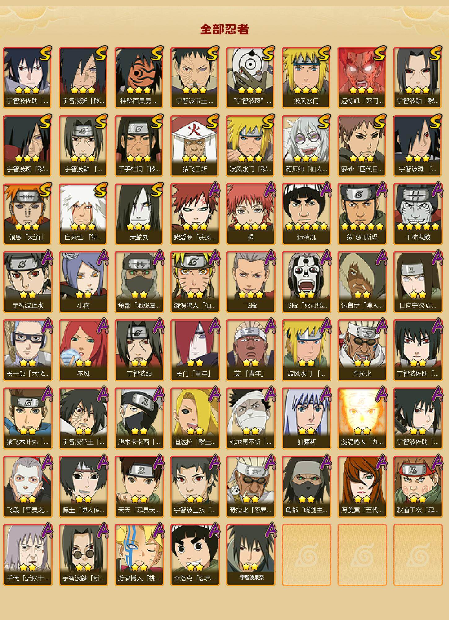 【S级忍者】:波风水门「秽土转生」(3星),千手柱间「秽土转生」(3星),宇智波鼬「秽土转生」(3星),宇智波斑「秽土转生」(3星),宇智波斑「秽土转生·解」(3星),宇智波带土「忍界大战」(3星),宇智波鼬「须佐能乎」(3星),宇智波斑「木叶创立」(3星),罗砂「四代目风影」(3星),自来也「舞之豪杰」(3星),大蛇丸(3星),猿飞日斩(3星),波风水门(3星)