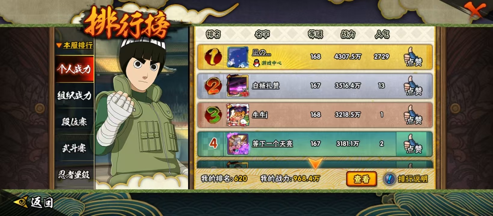 [17701613]实名: 可修改 贵族等级: V11 S忍数: 17 A忍数: 50 战力值(万): 968 S级忍者: 千手柱间「秽土转生」,宇智波鼬「秽土转生」,药师兜「仙人模式」,宇智波斑「秽土转生」,纲手「百豪」,波风水门「秽土转生」,艾「四代目雷影」,佩恩「天道」,波风水门,宇智波鼬 「须佐能乎」,迈特凯「死门」,宇智波带土 「忍界大战」,自来也 「舞之豪杰」,宇智波斑「白面具」,宇