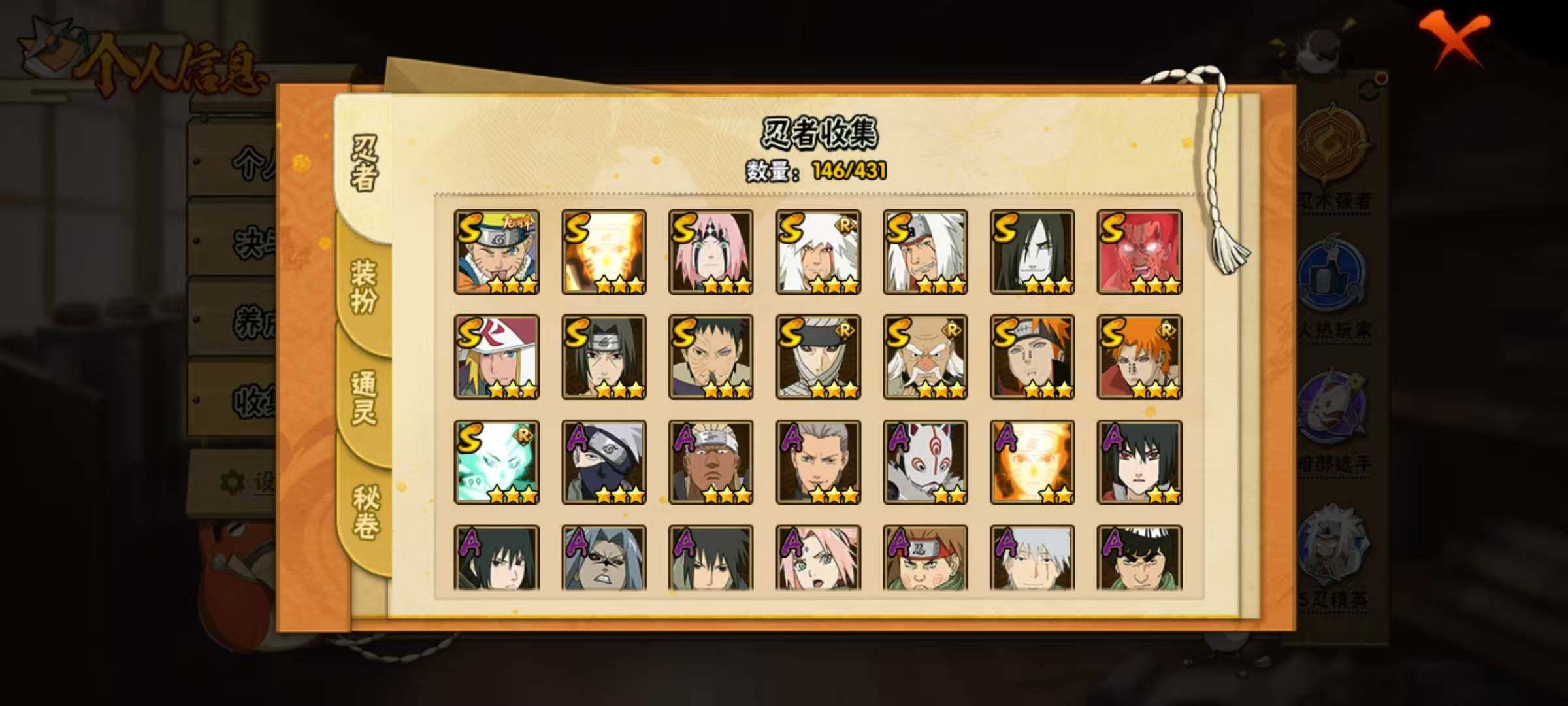 【S级忍者】:大野木「忍界大战」(3星),春野樱「忍界大战」(3星),宇智波带土「忍界大战」(3星),宇智波鼬「须佐能乎」(3星),无「二代目土影」(3星),自来也「舞之豪杰」(3星),大蛇丸(3星),自来也「传说中的三忍」(3星),波风水门(3星),漩涡鸣人「九喇嘛连结」(3星),迈特凯「死门」(3星),佩恩「天道」(3星),佩恩·天道「超」(3星),大筒木舍人