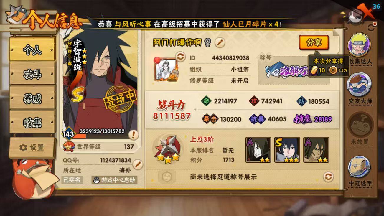 【S级忍者】:猿飞日斩「秽土转生」(3星),千手扉间「秽土转生」(3星),千手柱间「秽土转生」(3星),宇智波斑「秽土转生·解」(3星),艾「忍界大战」(3星),宇智波鼬「须佐能乎」(3星),宇智波止水「须佐能乎」(3星),旗木卡卡西「须佐能乎」(3星),千手柱间「木叶创立」(3星),自来也「舞之豪杰」(3星),自来也「传说中的三忍」(3星),波风水门(3星),神