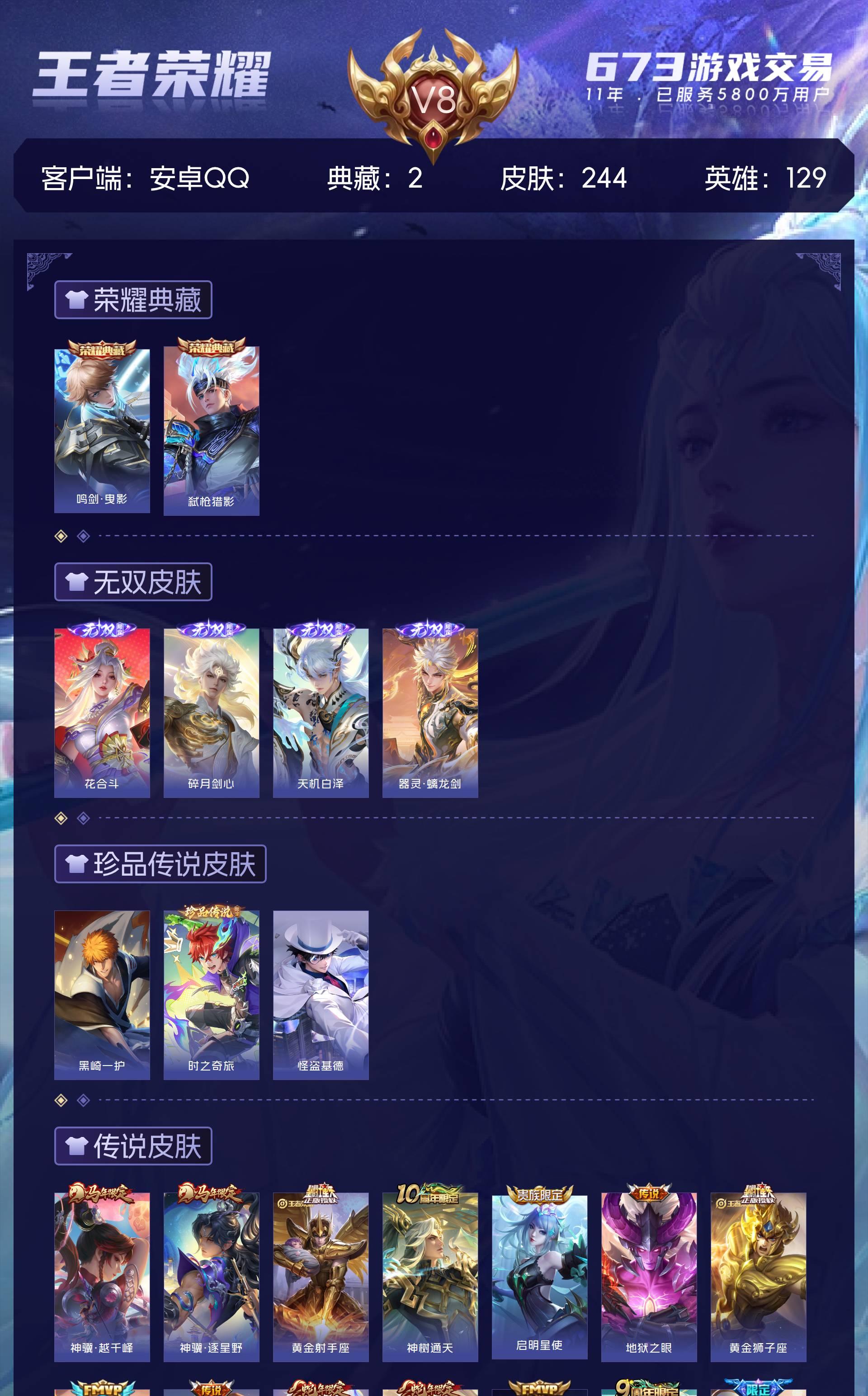 V8 皮肤244 英雄129 至尊星耀 荣耀典藏2 无双皮肤4 珍品传说3 星传说1 传说17