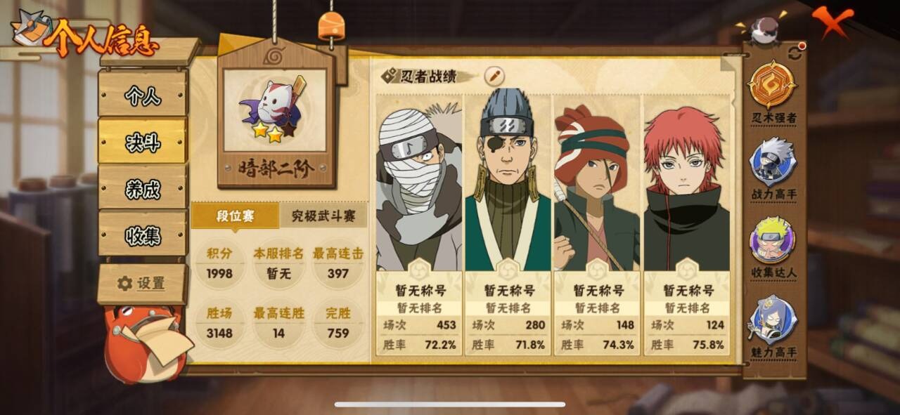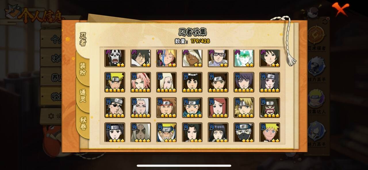 [17590801]实名: 可修改 贵族等级: V10 S忍数: 21 A忍数: 35 战力值(万): 929 S级忍者: 千手柱间「秽土转生」,罗砂「四代目风影」,宇智波斑 「木叶创立」,佩恩「天道」,大蛇丸,波风水门,纲手,宇智波鼬 「须佐能乎」,迈特凯「死门」,宇智波带土 「忍界大战」,自来也 「舞之豪杰」,宇智波斑「白面具」,漩涡鸣人 「九喇嘛连结」,春野樱 「忍界大战」,神秘面具男 「
