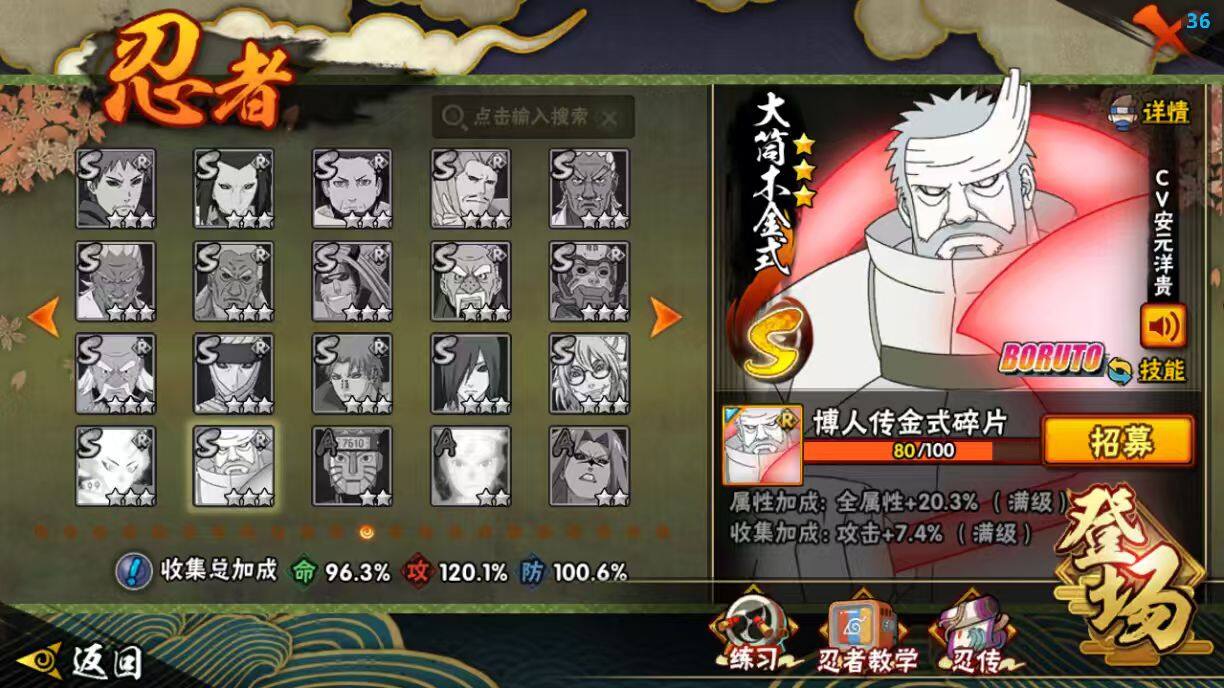【S级忍者】:波风水门「秽土转生」(3星),千手扉间「秽土转生」(3星),宇智波斑「秽土转生」(3星),宇智波斑「秽土转生·解」(3星),宇智波带土「忍界大战」(3星),宇智波鼬「须佐能乎」(3星),旗木卡卡西「须佐能乎」(3星),自来也「舞之豪杰」(3星),大蛇丸(3星),自来也「传说中的三忍」(3星),纲手(3星),波风水门(3星),神秘面具男(3星),漩涡鸣