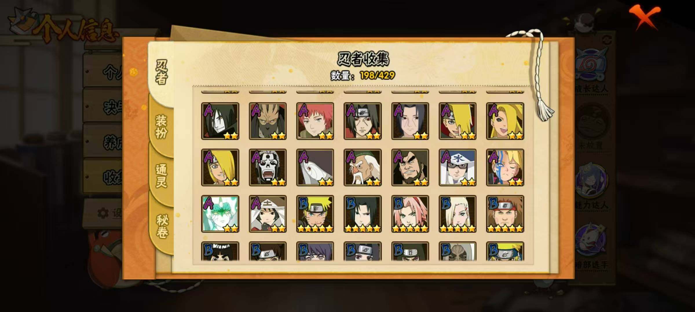 【S级忍者】:三代目风影「秽土转生」(3星),宇智波斑「秽土转生·解」(3星),宇智波带土「忍界大战」(3星),艾「忍界大战」(3星),宇智波鼬「须佐能乎」(3星),宇智波止水「须佐能乎」(3星),旗木卡卡西「须佐能乎」(3星),千手柱间「木叶创立」(3星),自来也(3星),自来也「舞之豪杰」(3星),自来也「传说中的三忍」(3星),纲手「百豪」(3星),波风水门