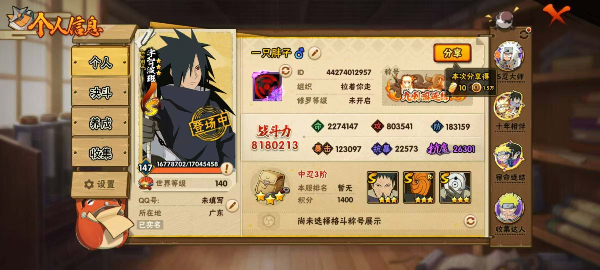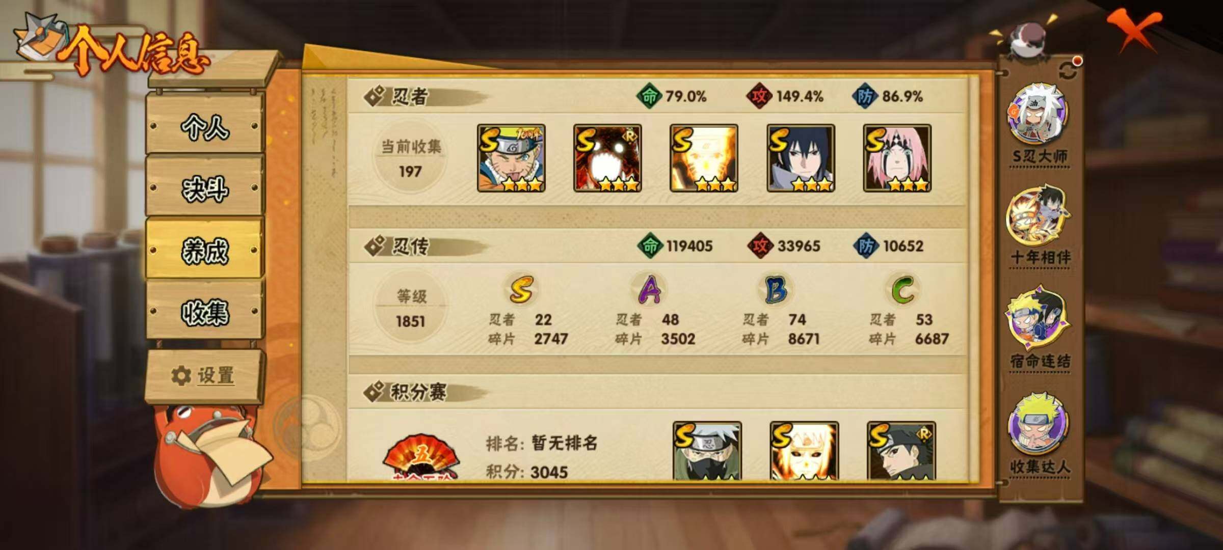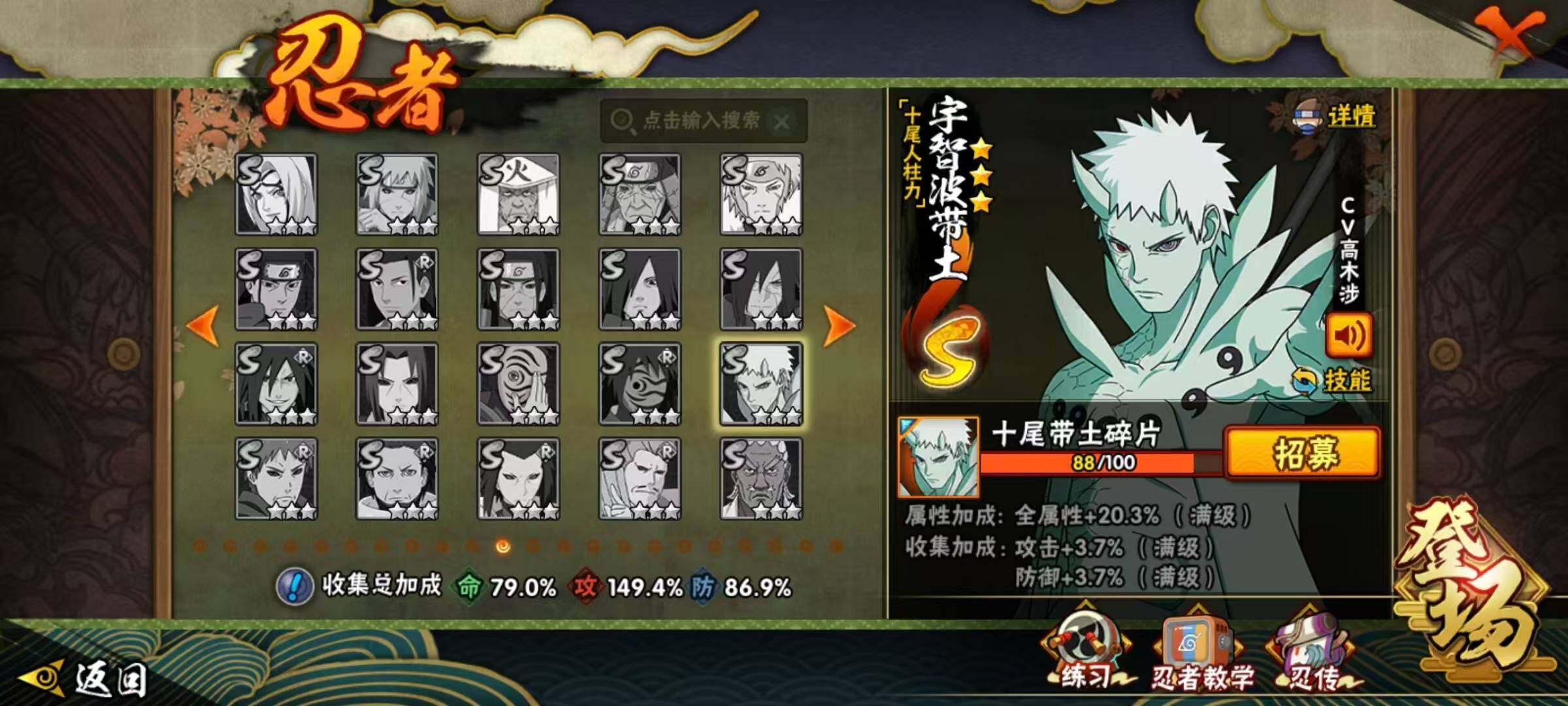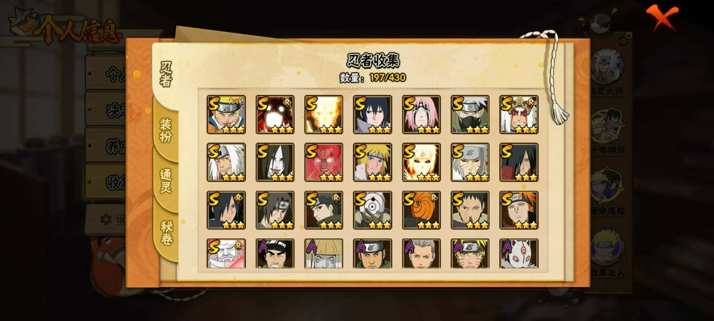 【S级忍者】:千手扉间「秽土转生」(3星),宇智波斑「秽土转生」(3星),春野樱「忍界大战」(3星),宇智波带土「忍界大战」(3星),宇智波鼬「须佐能乎」(3星),宇智波止水「须佐能乎」(3星),旗木卡卡西「须佐能乎」(3星),宇智波斑「木叶创立」(3星),自来也「舞之豪杰」(3星),大蛇丸(3星),自来也「传说中的三忍」(3星),波风水门(3星),漩涡鸣人「九喇