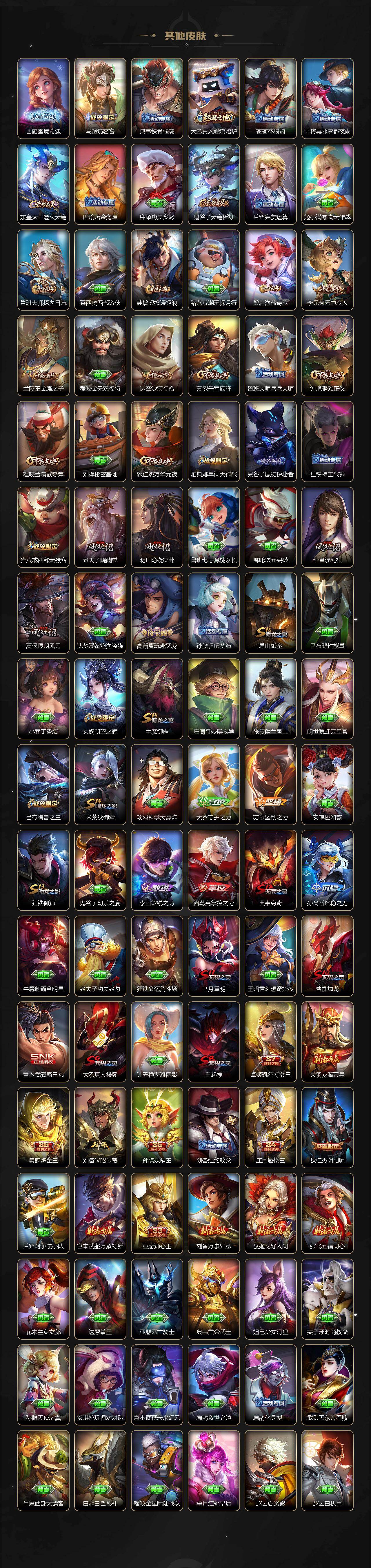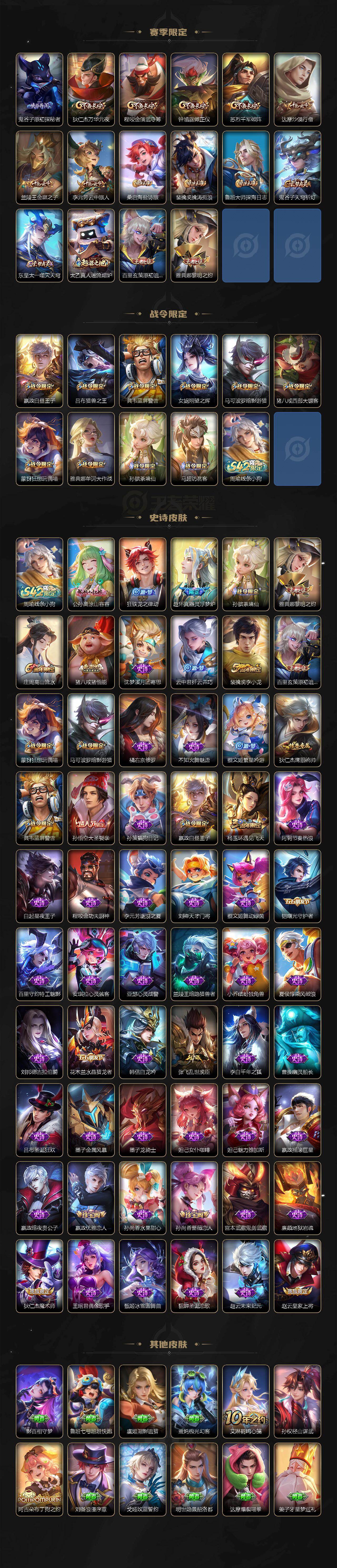 【限定皮肤】:白起狰,狄仁杰阴阳师,虞姬凯尔特女王,赵云皇家上将,嬴政优雅恋人,嬴政白昼王子,孙尚香蔷薇恋人,庄周蜃楼王,庄周高山流水,高渐