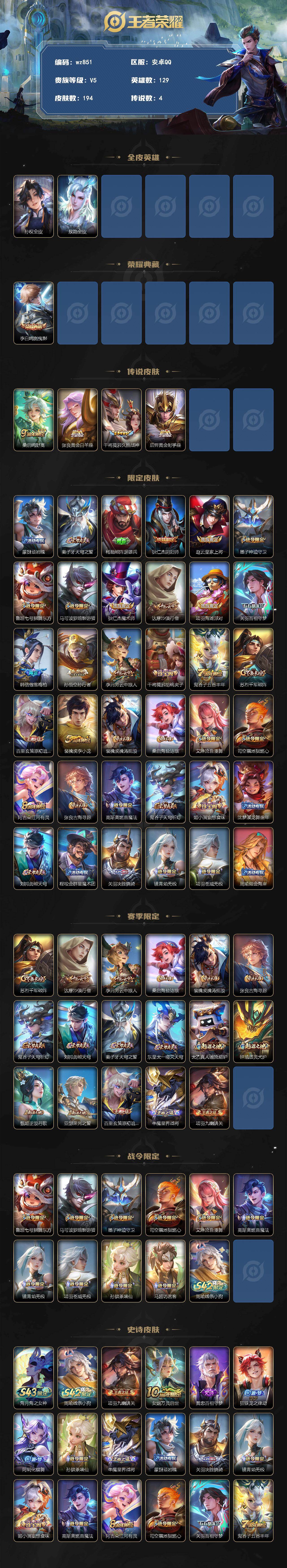安卓Q-V5-至尊星耀IV段位-129英雄-194皮肤-1典藏皮肤-4传说-5