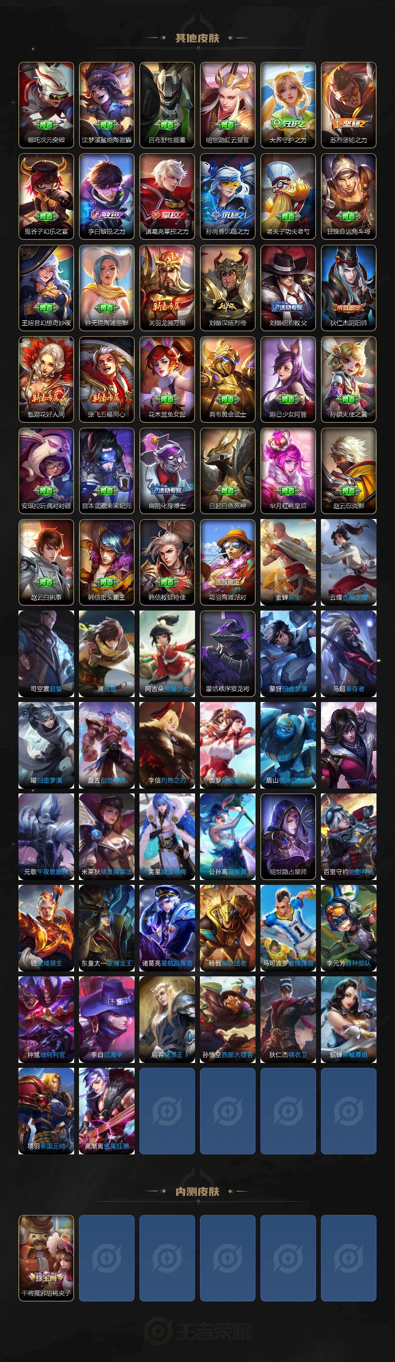 【限定皮肤】:蒙犽顽岩魄,姜子牙天穹之誓,杨戬破阵退雄兵,狄仁杰阴阳师,赵云皇家上将,墨子神迹守卫,鲁班七号狮舞东方,马可波罗暗影游猎,狄仁杰