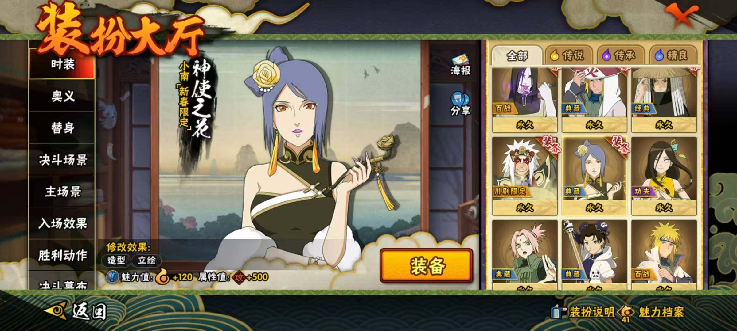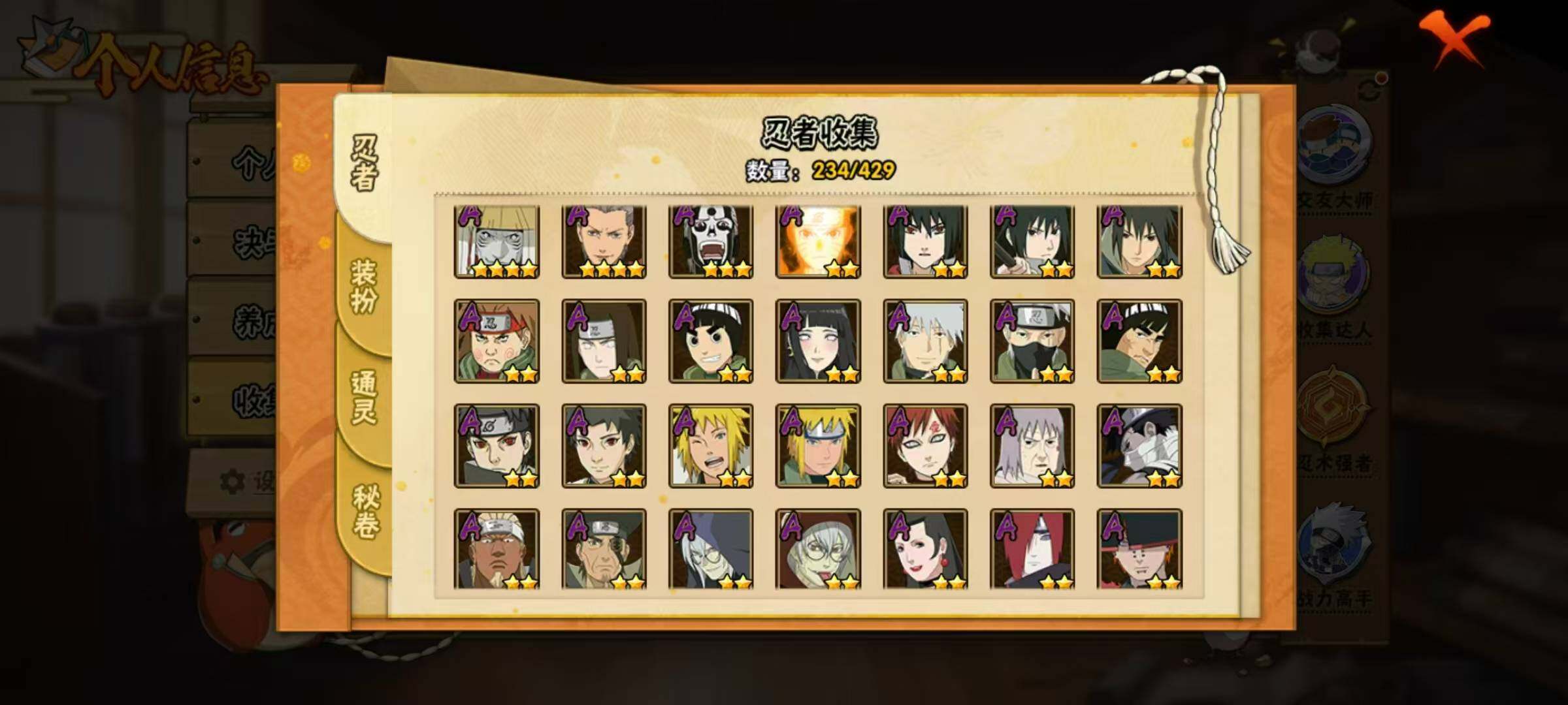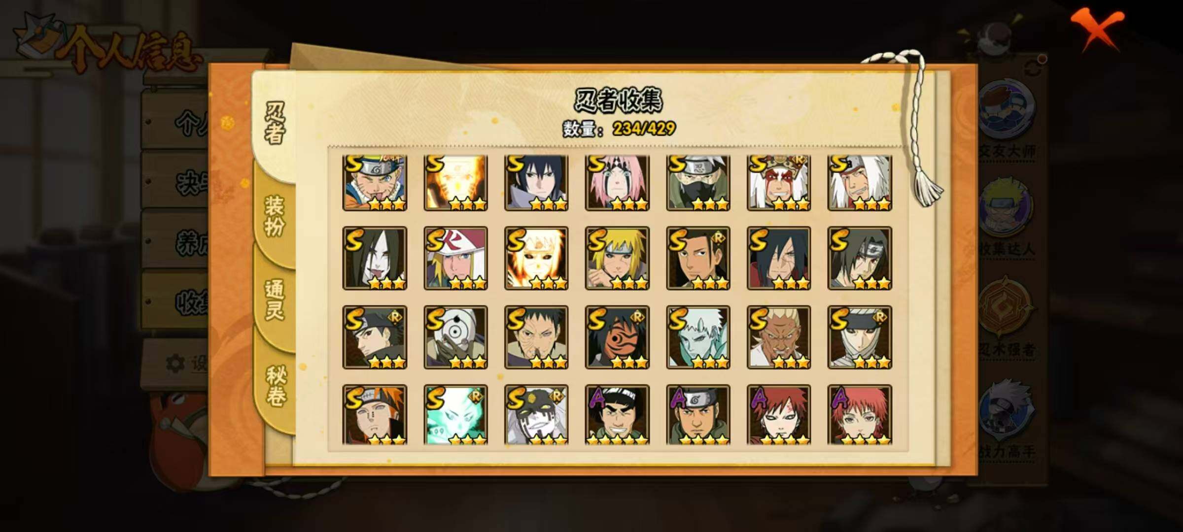 【S级忍者】:波风水门「秽土转生」(3星),宇智波斑「秽土转生·解」(3星),春野樱「忍界大战」(3星),宇智波带土「忍界大战」(3星),艾「忍界大战」(3星),宇智波鼬「须佐能乎」(3星),宇智波止水「须佐能乎」(3星),旗木卡卡西「须佐能乎」(3星),千手柱间「木叶创立」(3星),无「二代目土影」(3星),自来也「舞之豪杰」(3星),大蛇丸(3星),自来也「传