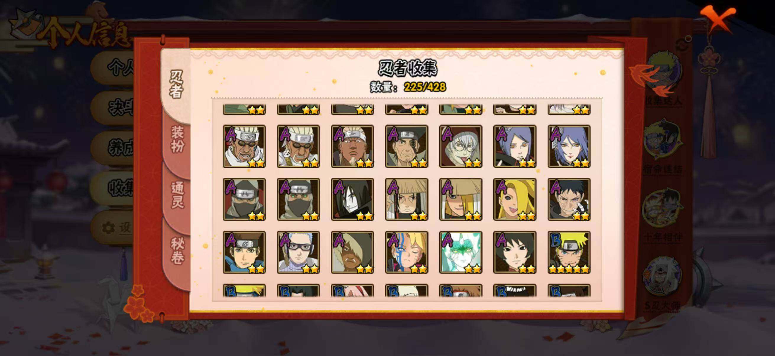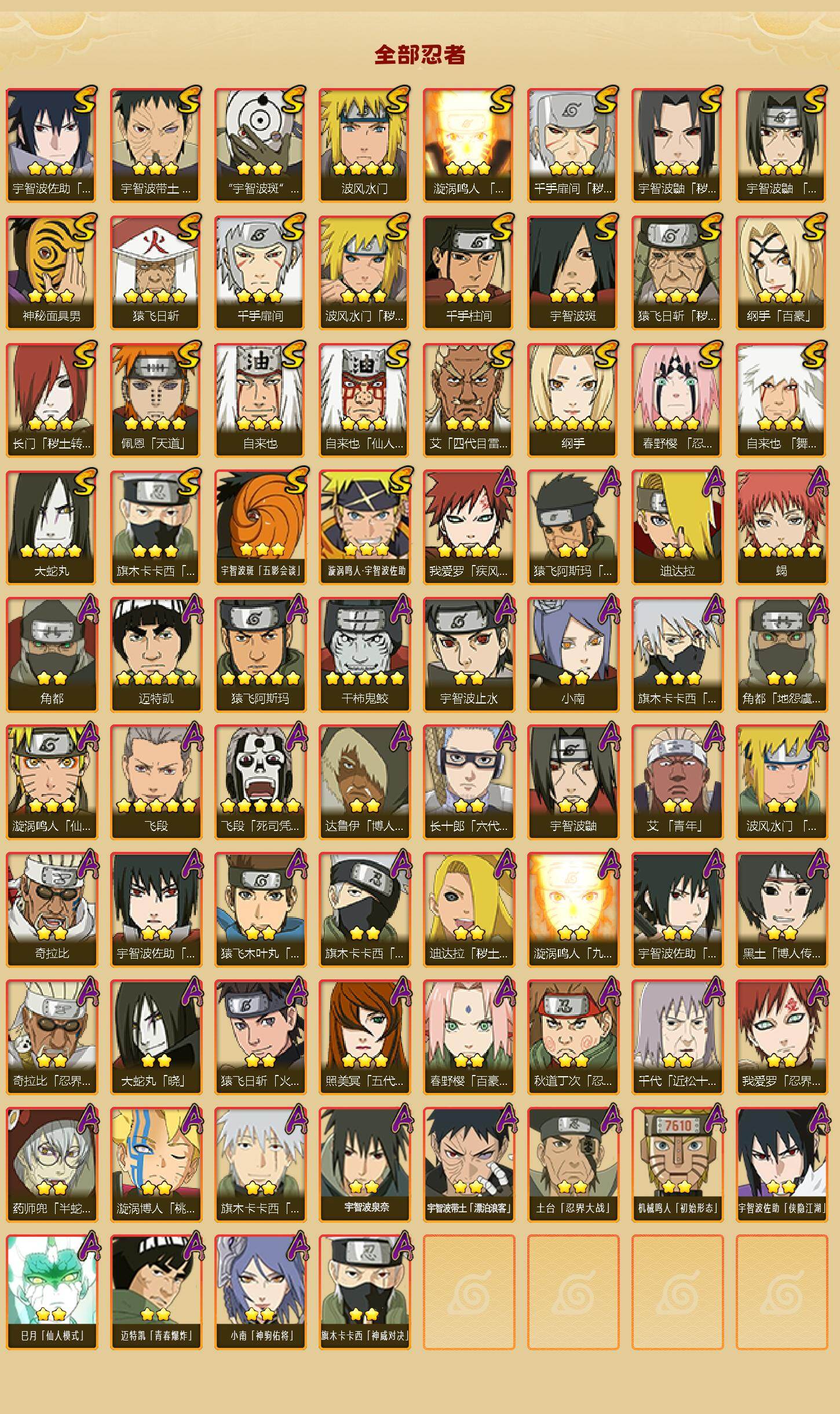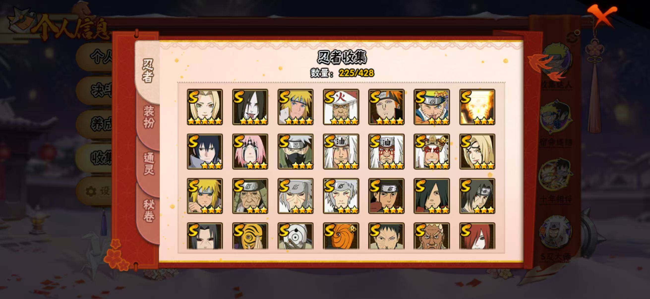 28S级忍者数-48A级忍者数198忍法帖已开,柱间63片,解斑68片,带土