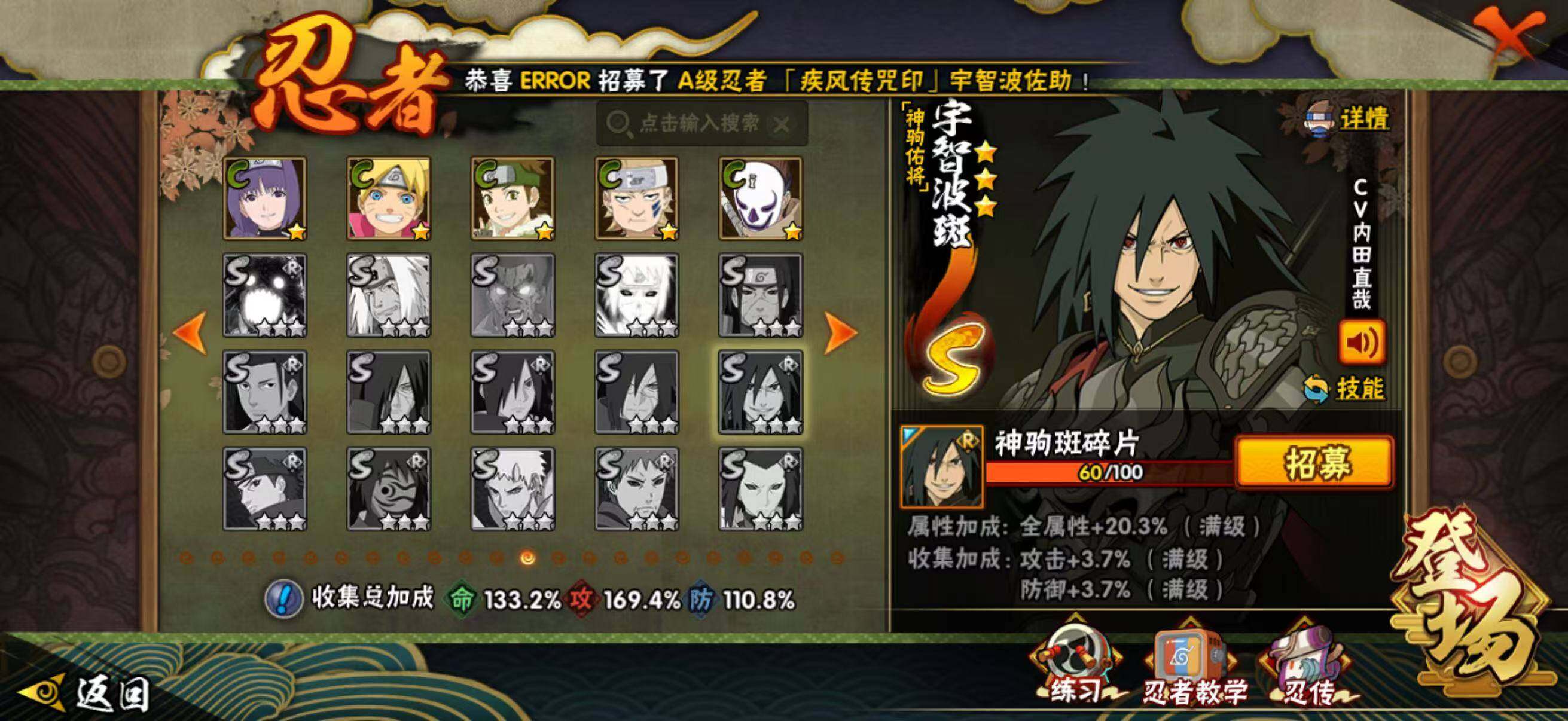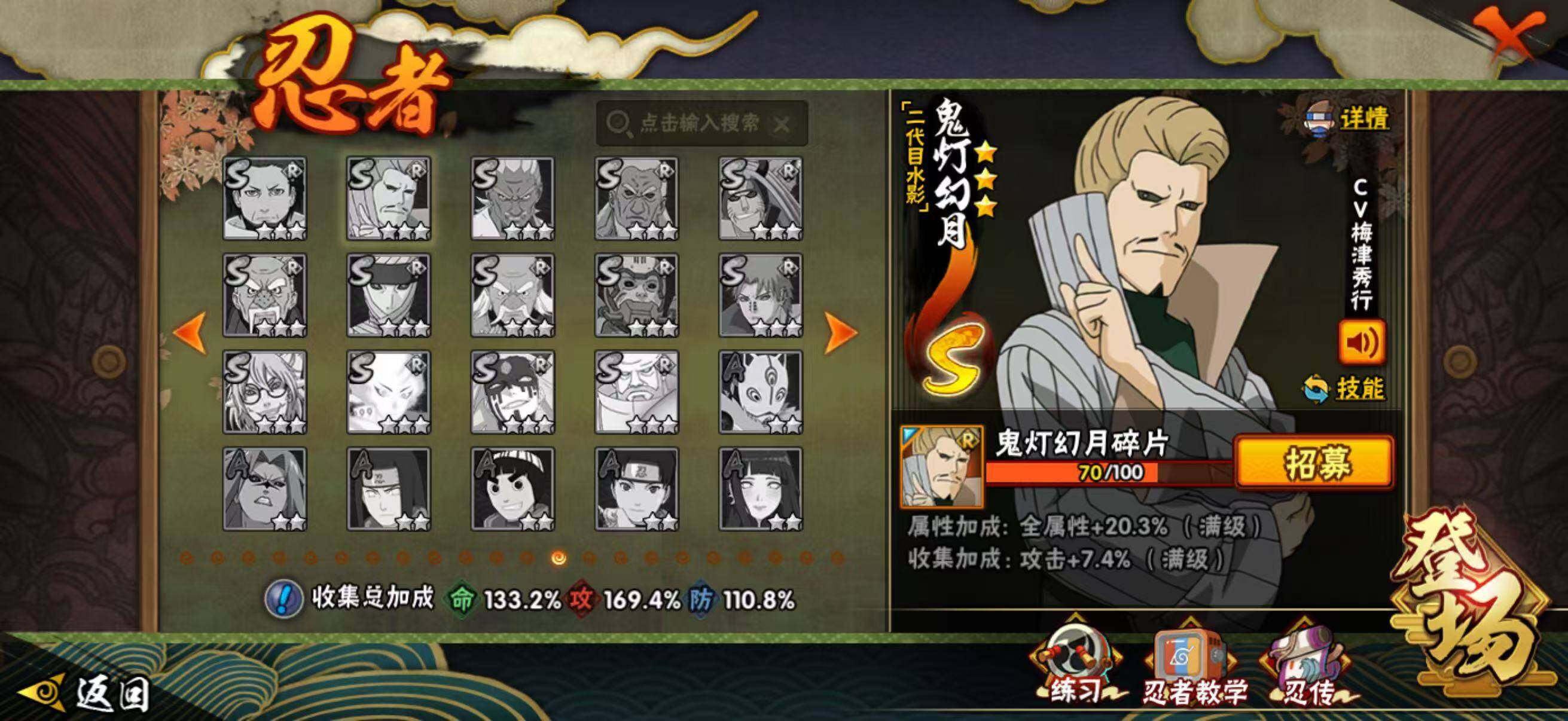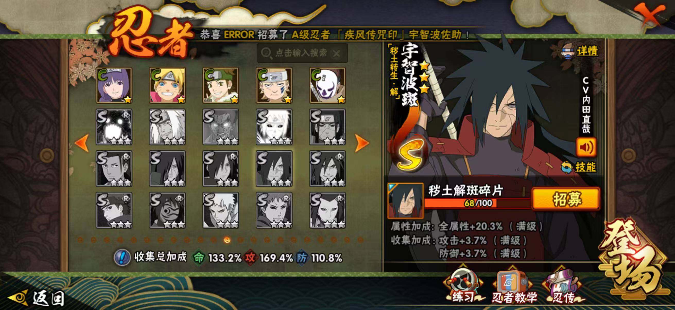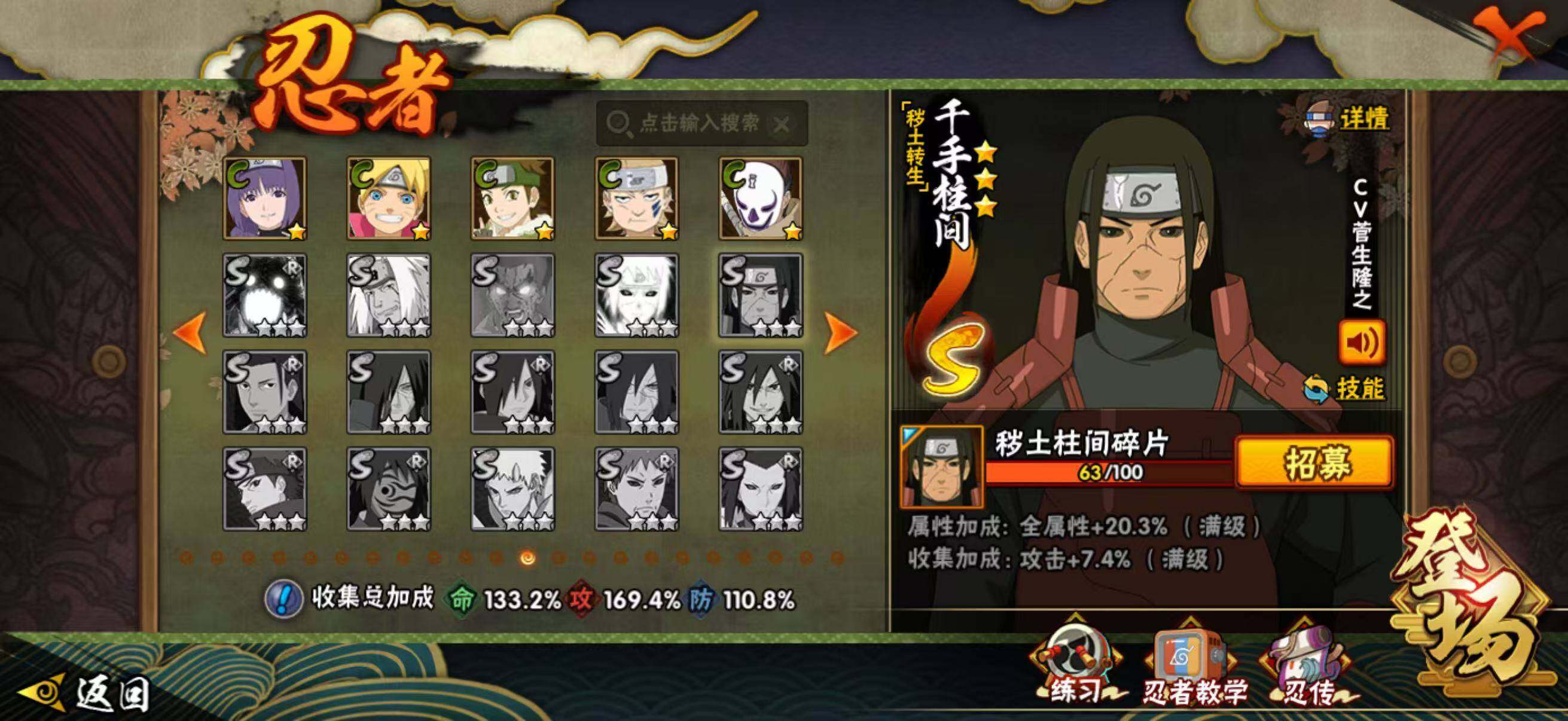 28S级忍者数-48A级忍者数198忍法帖已开,柱间63片,解斑68片,带土