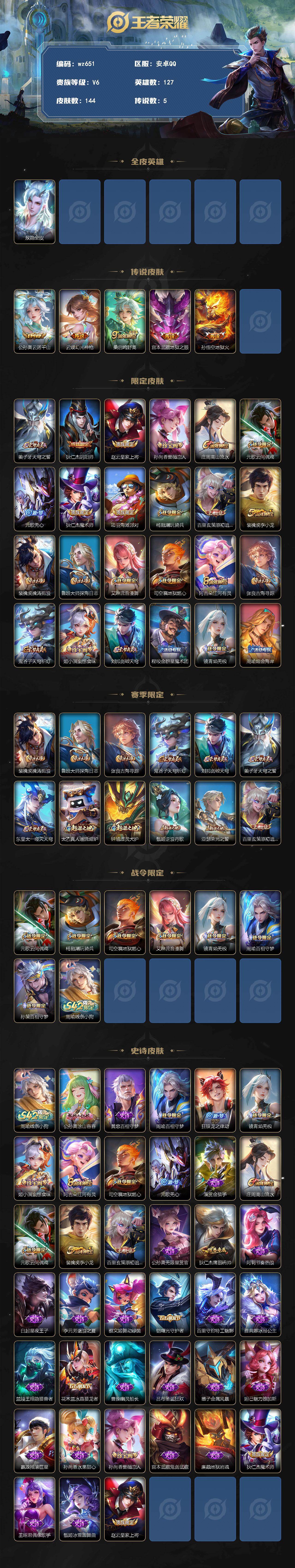 安卓Q-V6-至尊星耀III段位-127英雄-144皮肤-5传说-38史诗【