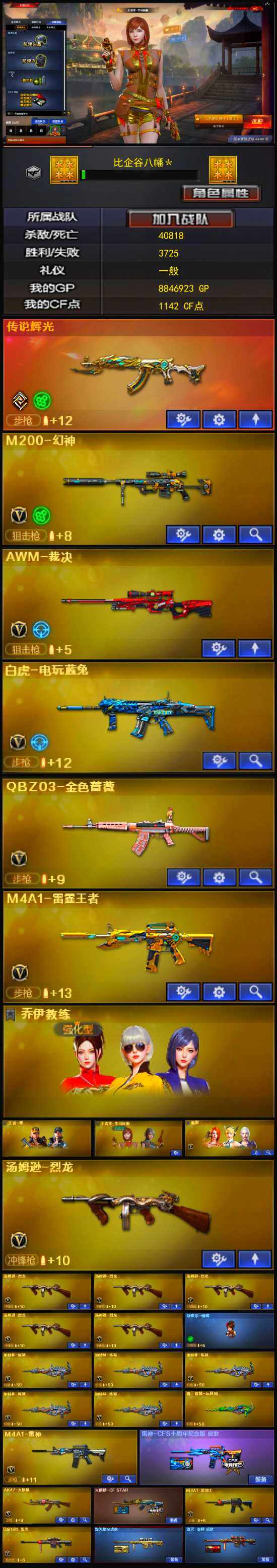 【热门武器】:传说辉光,QBZ03-金色蔷薇,M200-幻神,白虎-电玩蓝兔,金色小号,M4A1-黑骑士,汤姆逊-烈龙*6,加特林-炼狱*5,斯泰尔-蝴蝶,沙鹰-修罗*2