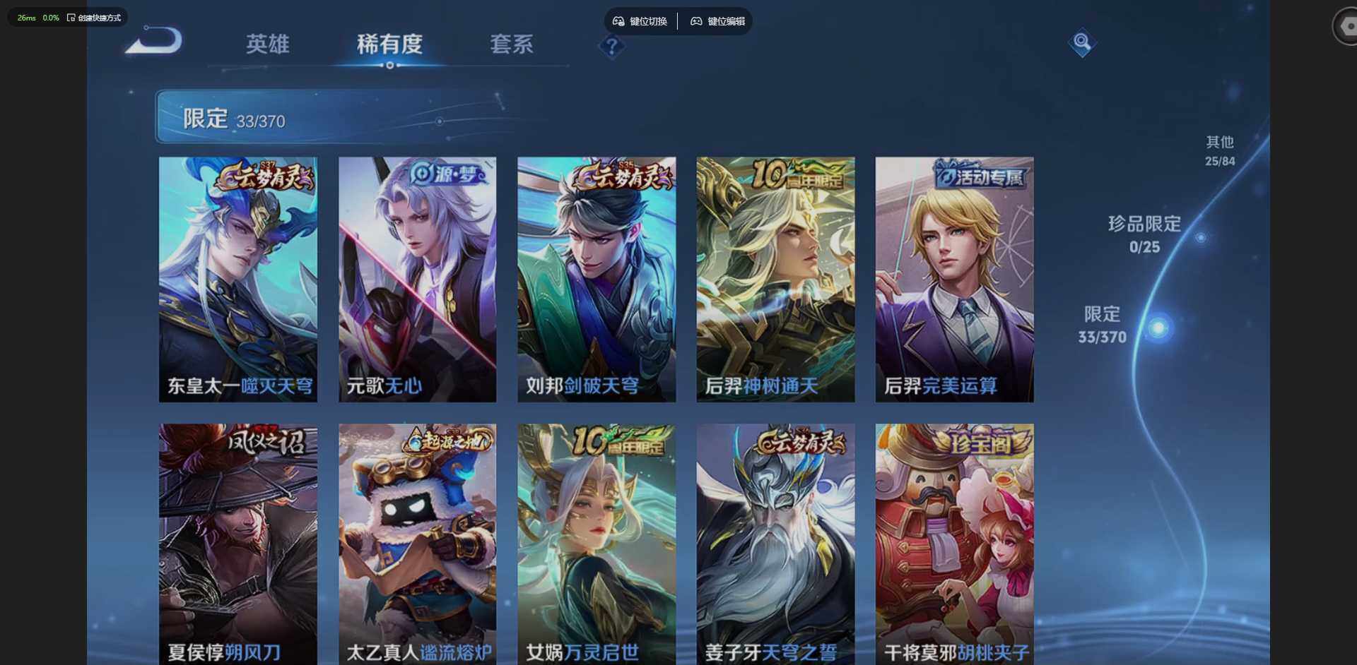实名: 可修改 贵族等级: V4 英雄数: 125 皮肤数: 114 传说皮: