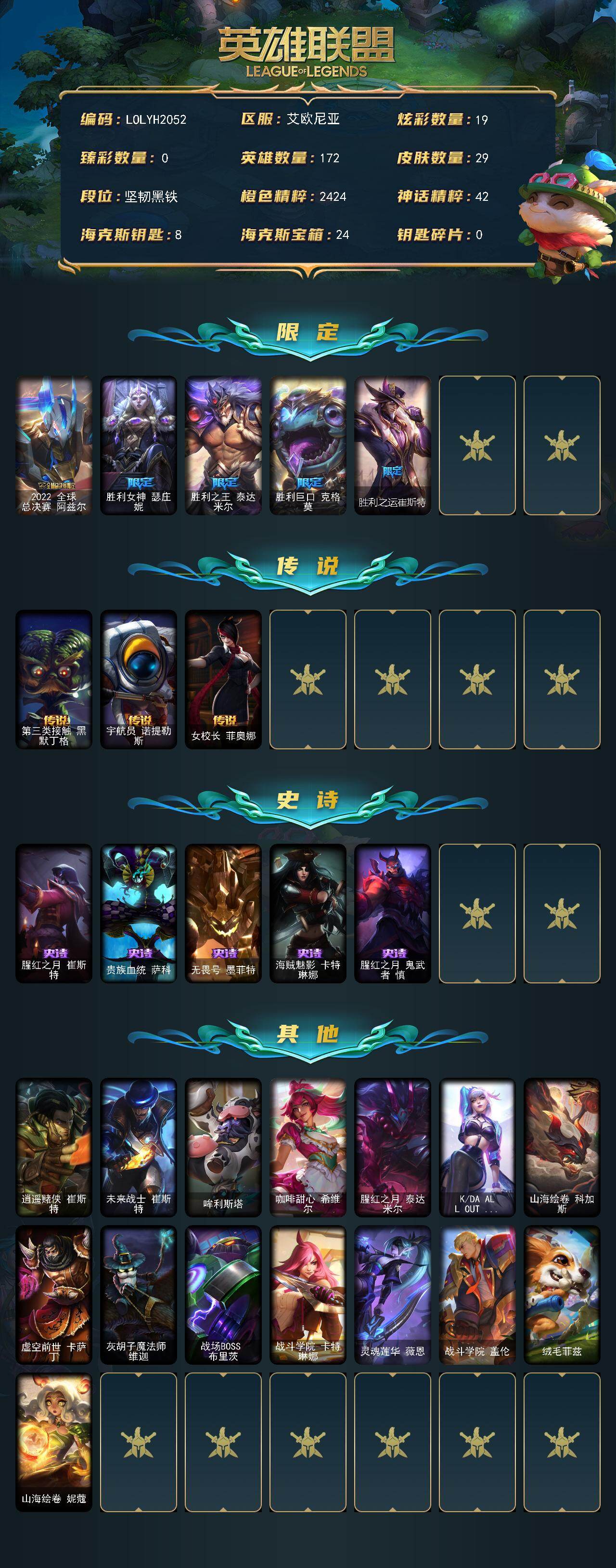 【LOLYH2052】172英雄/29皮肤/6限定/19炫彩/3传说/5史诗/未定级/2022全球总决赛阿兹尔/胜利女神瑟庄妮/胜利之王泰达米尔/胜利巨口克格莫/胜利之运崔斯特/第三类接触黑默丁格/宇航员诺提勒斯/女校长菲奥娜/腥红之月崔斯特/贵族血统萨科/无畏号墨菲特/海贼魅影卡特琳娜/腥红之月鬼武者慎/逍遥赌侠崔斯特/未来战士崔斯特/哞利斯塔/咖啡甜心希维尔/腥红之月泰达米尔/KDAALLOUT伊芙琳/山海绘卷科加斯/虚空前世卡萨丁/灰胡子魔法师维迦/战场BOSS布里茨/战斗学院卡特琳娜/灵