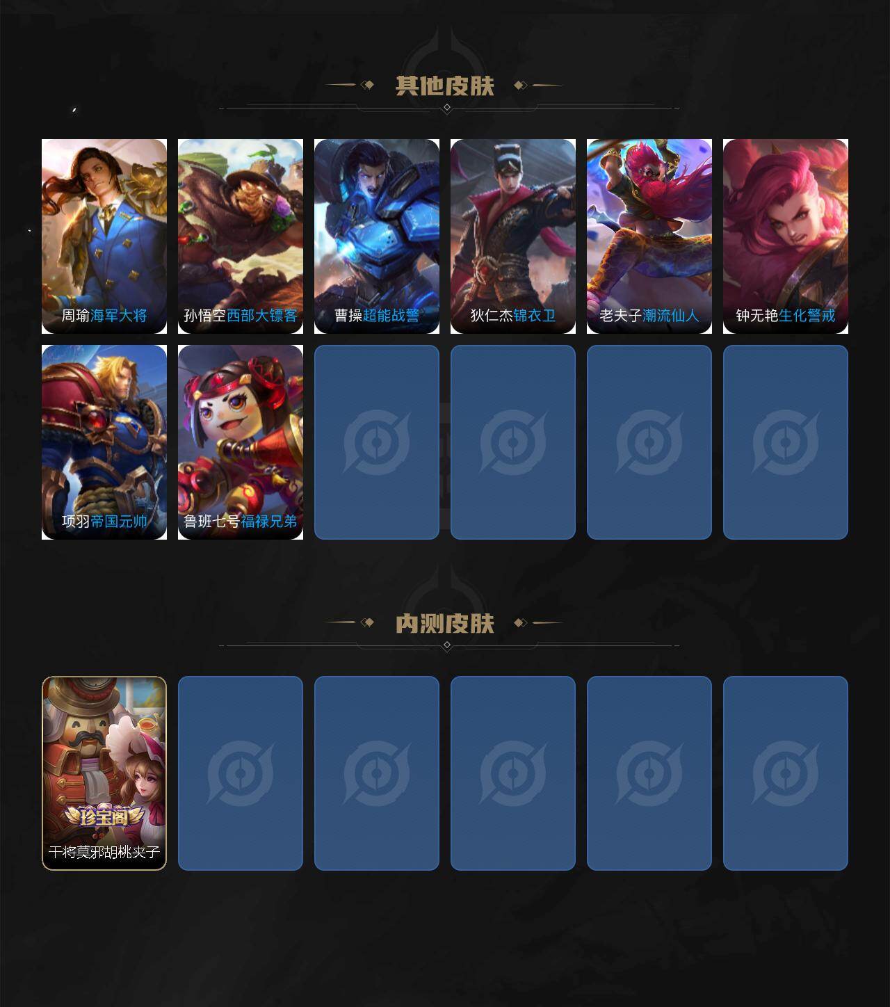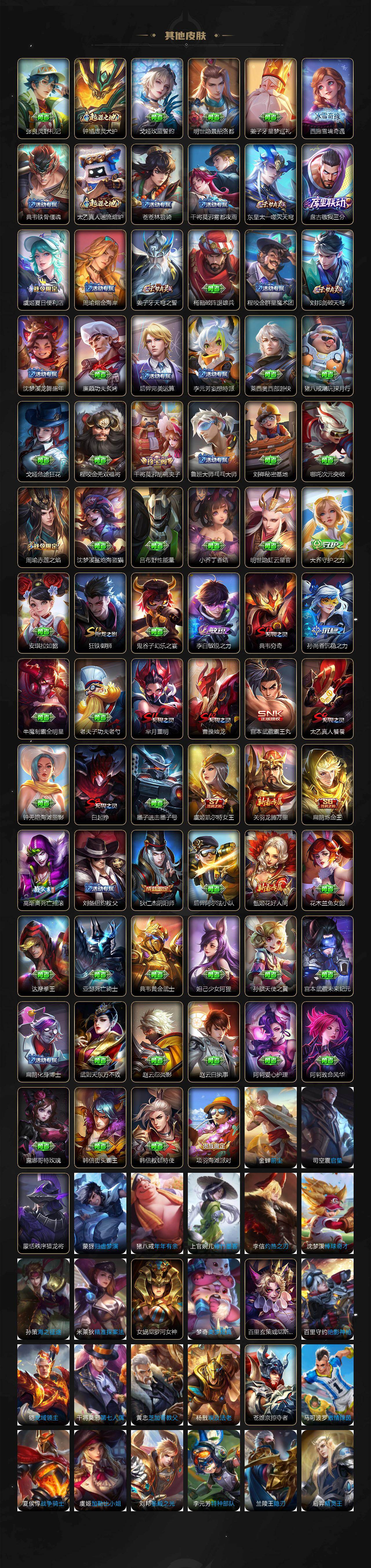 【限定皮肤】:白起狰,蔡文姬夏日便利店,虞姬夏日便利店,姜子牙天穹之誓,杨戬破阵退雄兵,狄仁杰阴阳师,虞姬凯尔特女王,赵云皇家上将,高渐离死亡摇滚,扁鹊炼金王,芈月重明,周瑜赤莲之焰,甄姬游