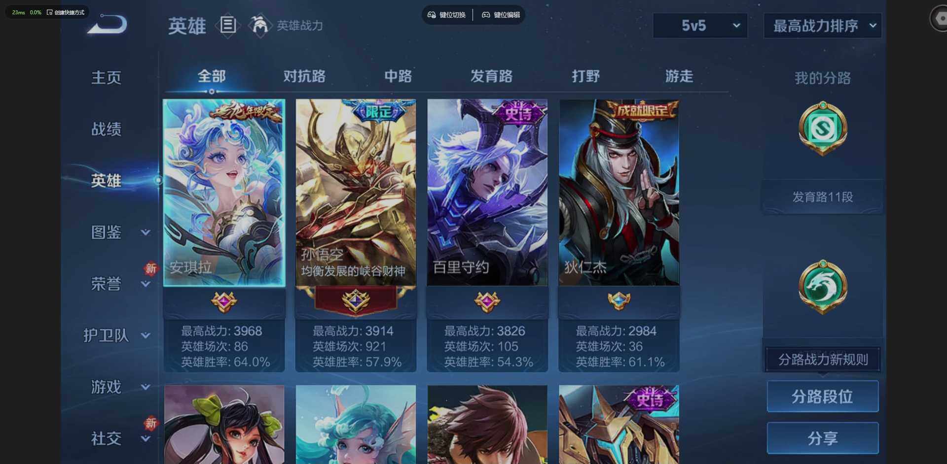 /贵族等级: V5 英雄数: 126 皮肤数: 126 星传说: 幽冥火 传说皮: 地狱火,零号·赤焰 限定皮: 梁祝,至尊宝,五谷丰年