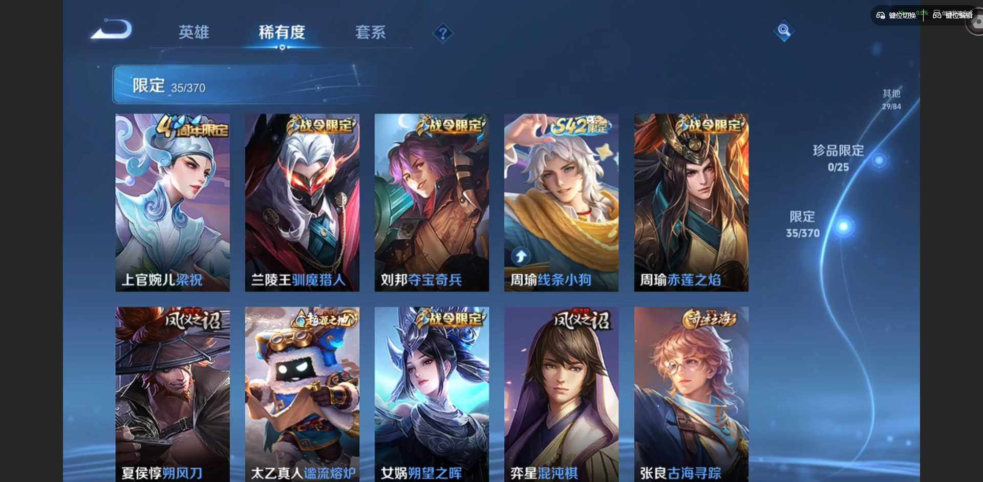 /实名: 可修改 贵族等级: V6 英雄数: 124 皮肤数: 123 星传说: 未来机甲 传说皮: 末日机甲-孙尚香,幻光神枪,神骥·逐星野 限定皮: 李小龙,梁祝,五谷丰年,愿照·岁时盈,愿照·福禄聚,愿照·九州拓