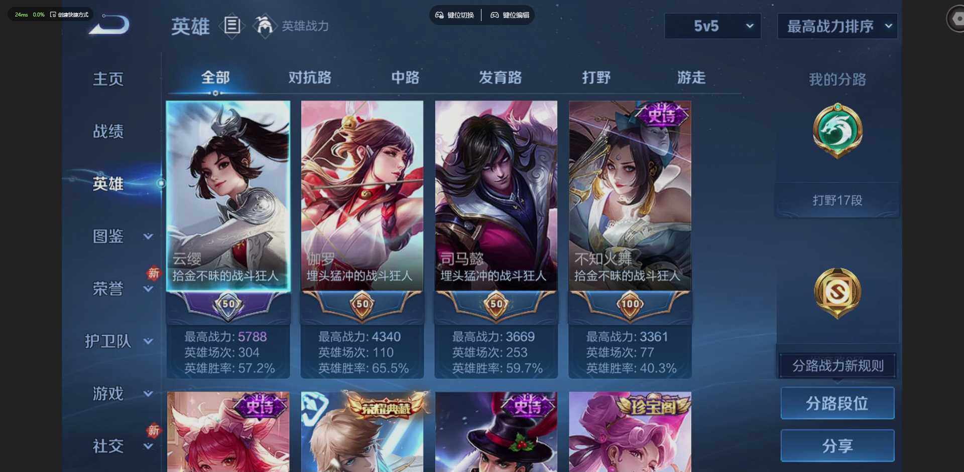 2136/实名: 可修改 贵族等级: V4 英雄数: 107 皮肤数: 80 荣耀水晶: 鸣剑·曳影 传说皮: 澜逐花归海 限定皮: 鸣野蒿
