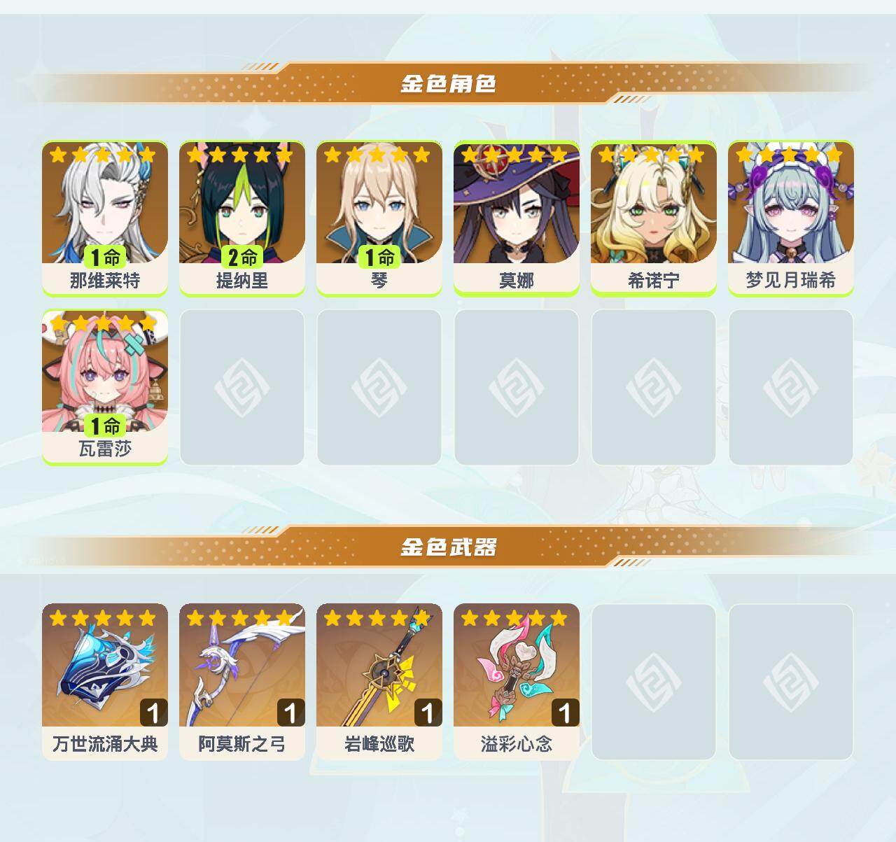 【YSZ3255】56级/16黄/女主/7个五星角色/4个五星武器/希诺宁/1命那维莱特/莫娜/2命提纳里/1命瓦雷莎/梦见月瑞希/1命琴/精1溢彩心念/万世流涌大典/岩峰巡歌/阿莫斯之弓