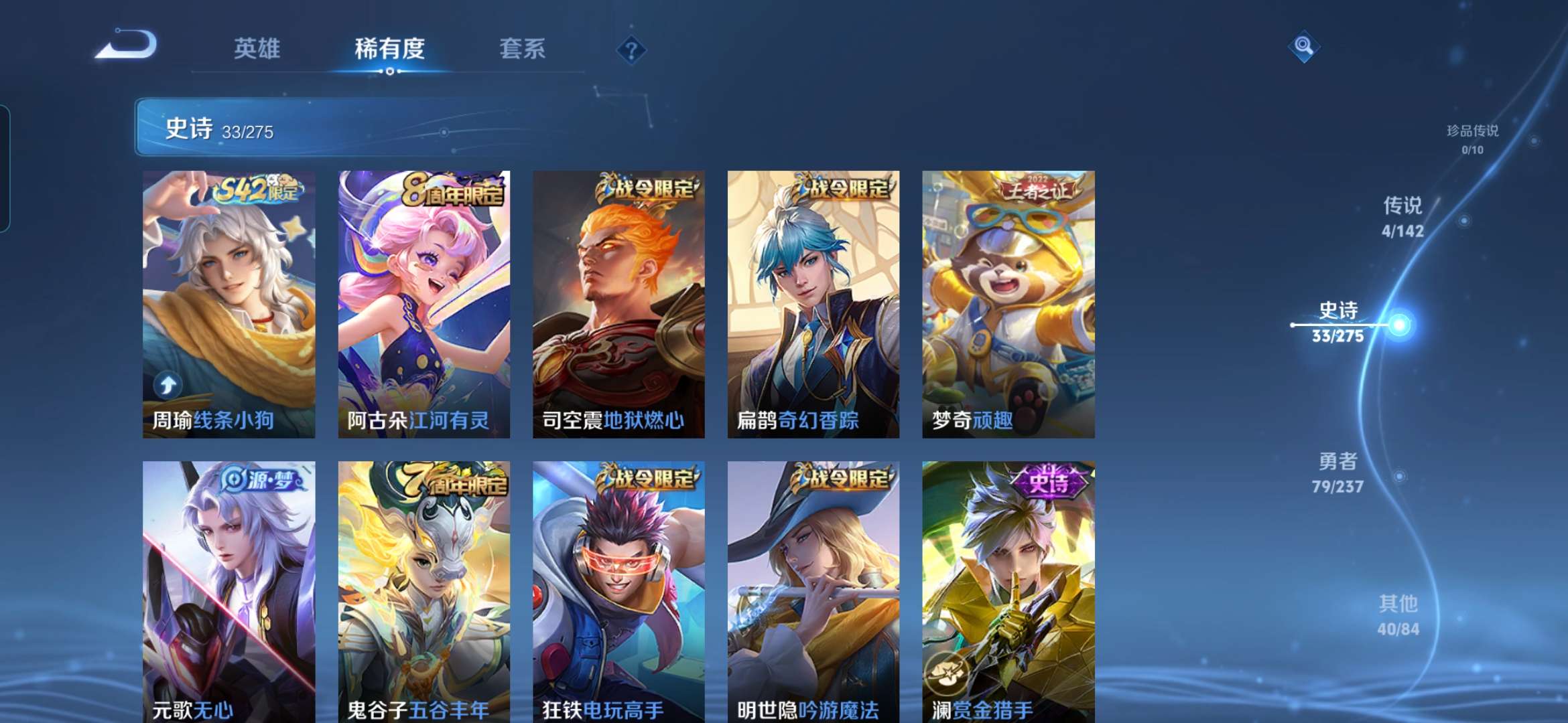 【史诗皮肤】 地狱燃心 线条小狗 聚星闪耀 江河有灵 死神来了 玉兔公主 奇幻香踪 顽趣 幽灵船长 功夫厨神 女仆咖啡 魅力维加斯