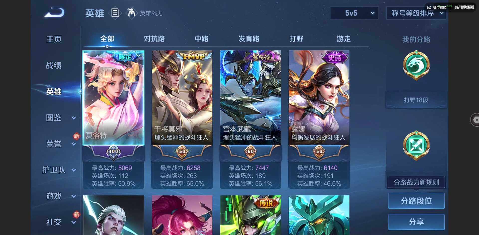 贵族等级: V6 英雄数: 97 皮肤数: 89 星传说: 幽冥之眼 传说皮: