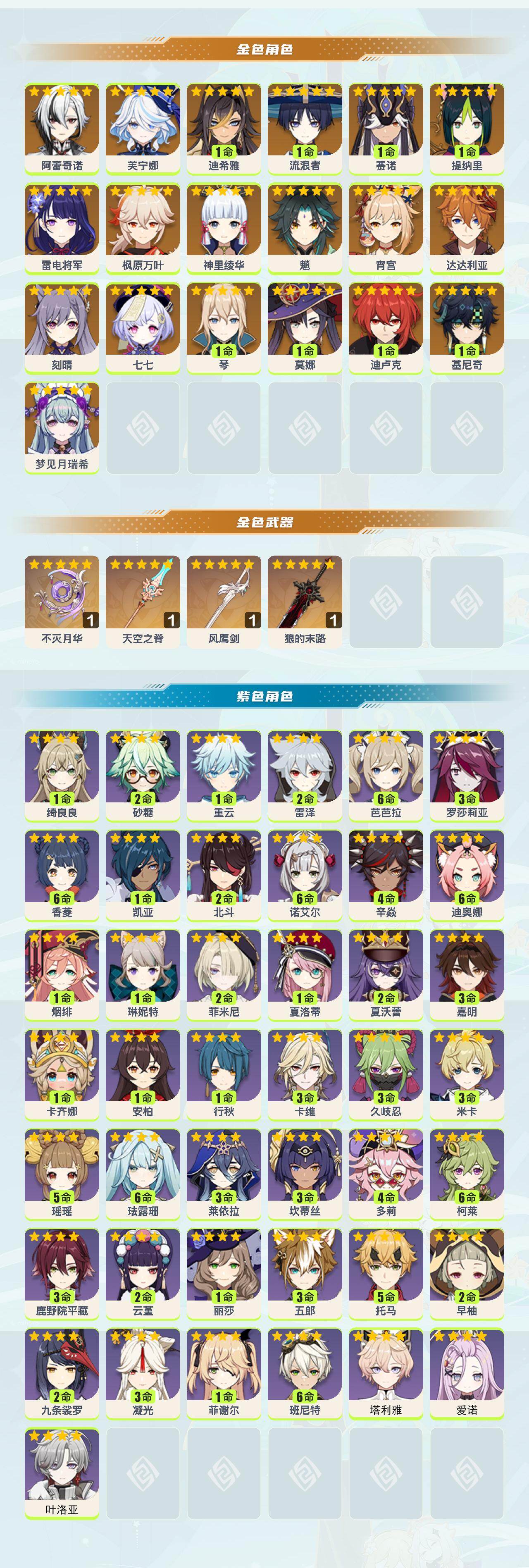 【YSZ3254】58级/男主/21个五星角色/梦见月瑞希/1命基尼奇/阿蕾奇诺/芙宁娜/1命迪希雅/1命流浪者/1命赛诺/1命提纳里/雷电将军/宵宫/神里绫华/枫原万叶/魈/达达利亚/1命琴/刻晴/1命迪卢克/1命莫娜/七七/不灭月华/狼的末路/风鹰剑/天空之脊/0命叶洛亚/0命爱诺/0命塔利雅/卡齐娜/3命嘉明/2命夏沃蕾/1命夏洛蒂/2命菲米尼/1命琳妮特/1命绮良良/3命卡维/3命米卡/5命瑶瑶/满命珐露珊/3命莱依拉/3命坎蒂丝/4命多莉/满命柯莱/3命鹿野院平藏/3命久岐忍/2命云堇