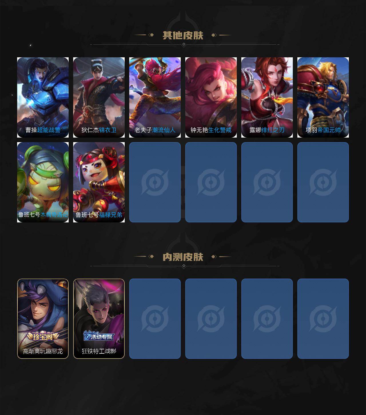 【传说皮肤】:诸葛亮鹤羽星尊,澜电玩雷克斯,夏洛特浮生妄,曜云鹰飞将,刘备时之恋人,宫本武藏地狱之眼