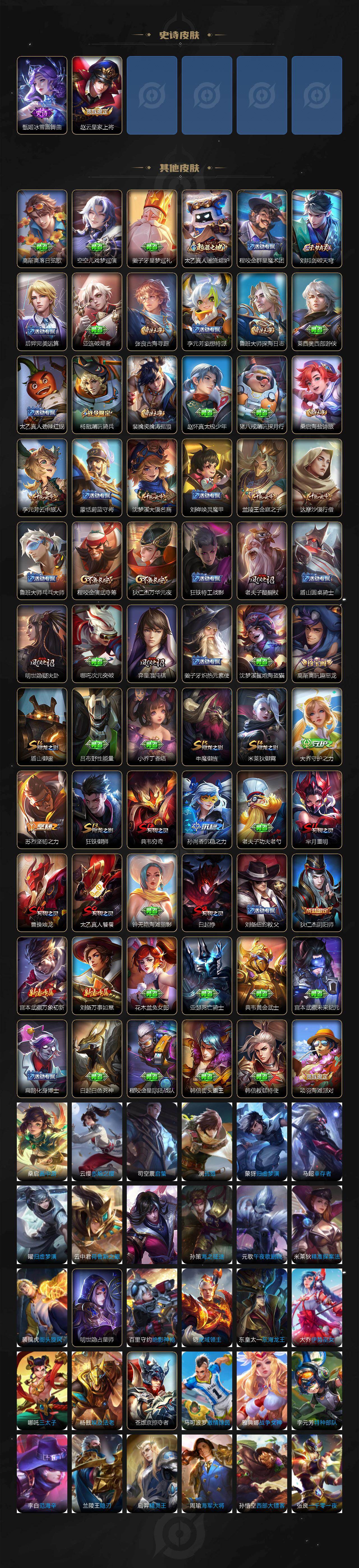 【限定皮肤】:白起狰,狄仁杰阴阳师,赵云皇家上将,高渐离玩趣恶龙,芈月重明,曹操烛龙,典韦穷奇,狄仁杰魔术师,狄仁杰万华元